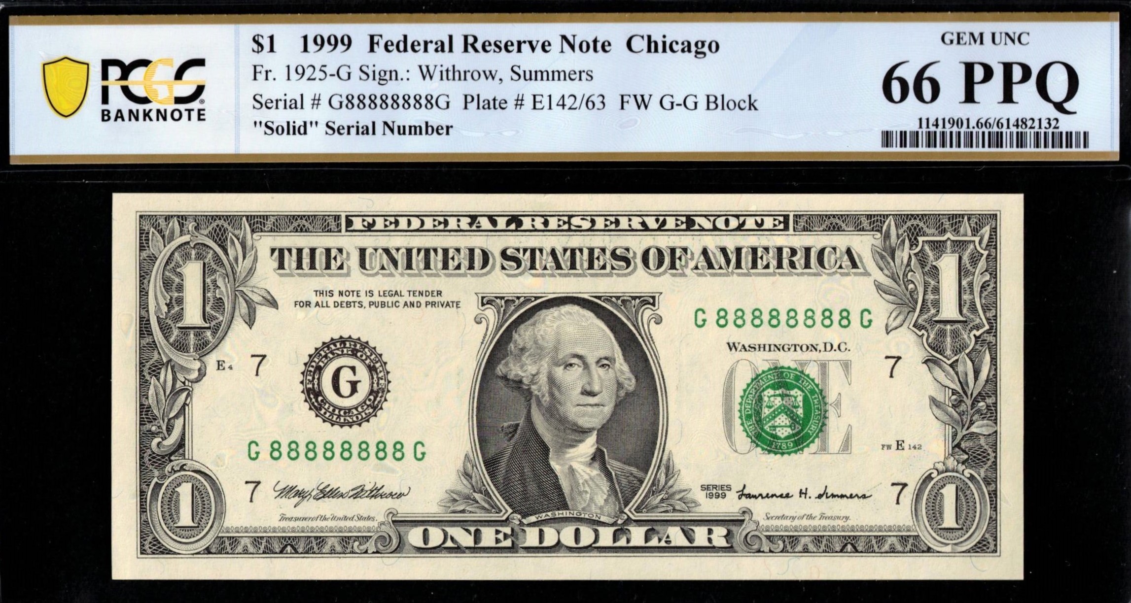 FR-1925-G 1999 Series One Dollar Federal Reserve Note from the Chicago District, serial number G88888888G, features a perfect solid number with matching prefix and suffix letters Making this solid standout even more than the normal. Graded by P.C.G.S as #66PPQ Gem Uncirculated with premium paper quality, it boasts full boardwalk margins, awesome eye appeal…. surely a great conversation piece for a solid serial number. Even so one of the most popular solids to come about. Solid 1’s-Solid 7’s-Solid 8’s.