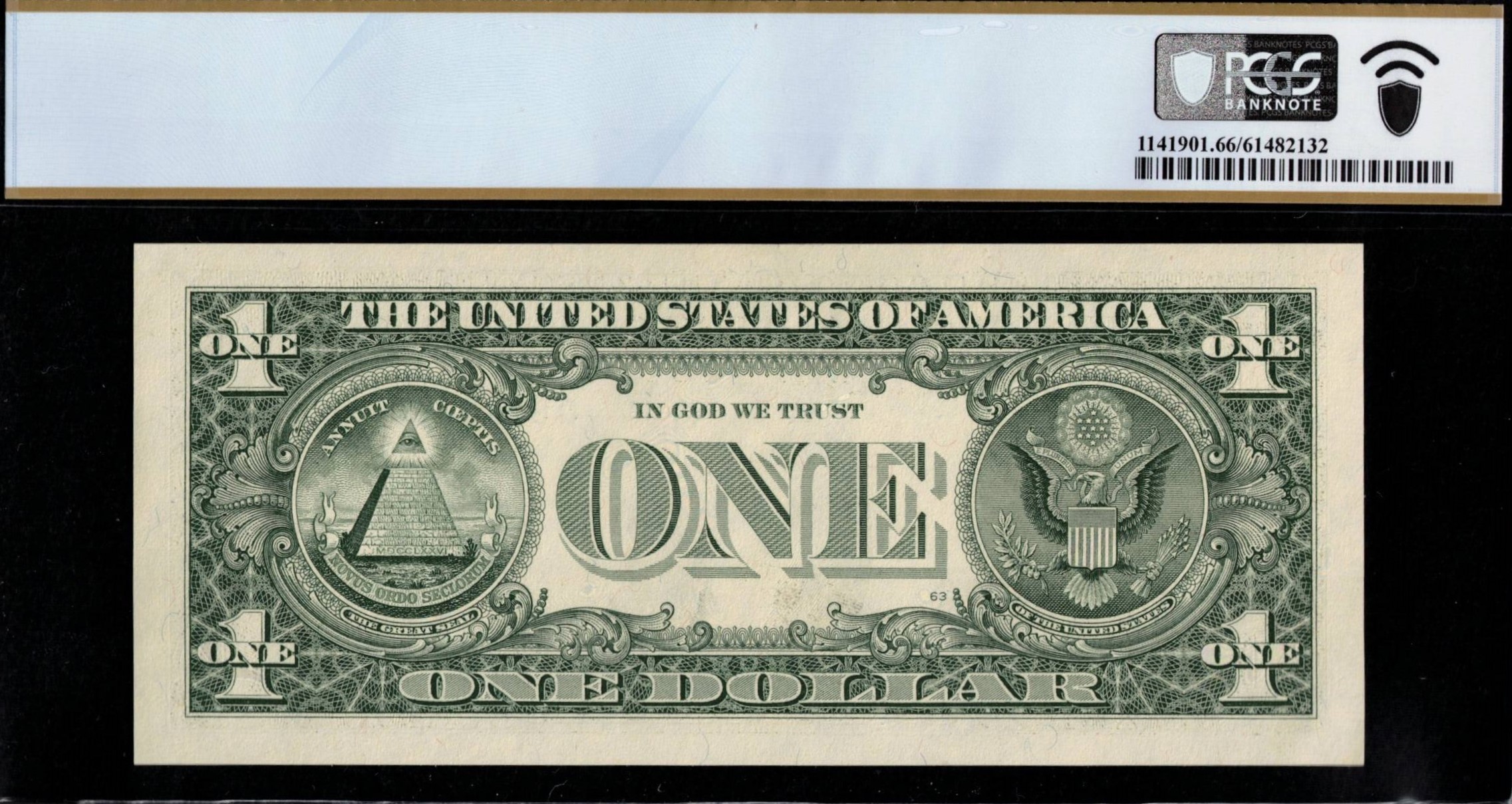 Only 14 solid nines are known to exist on $1 FRNs, with 95% from the 1963–1977A Series. The most recent was a 1963A Series $1 FRN G99999999C, graded P.M.G #64EPQ, which realized $28,000.00 in a 2025 H/A auction.