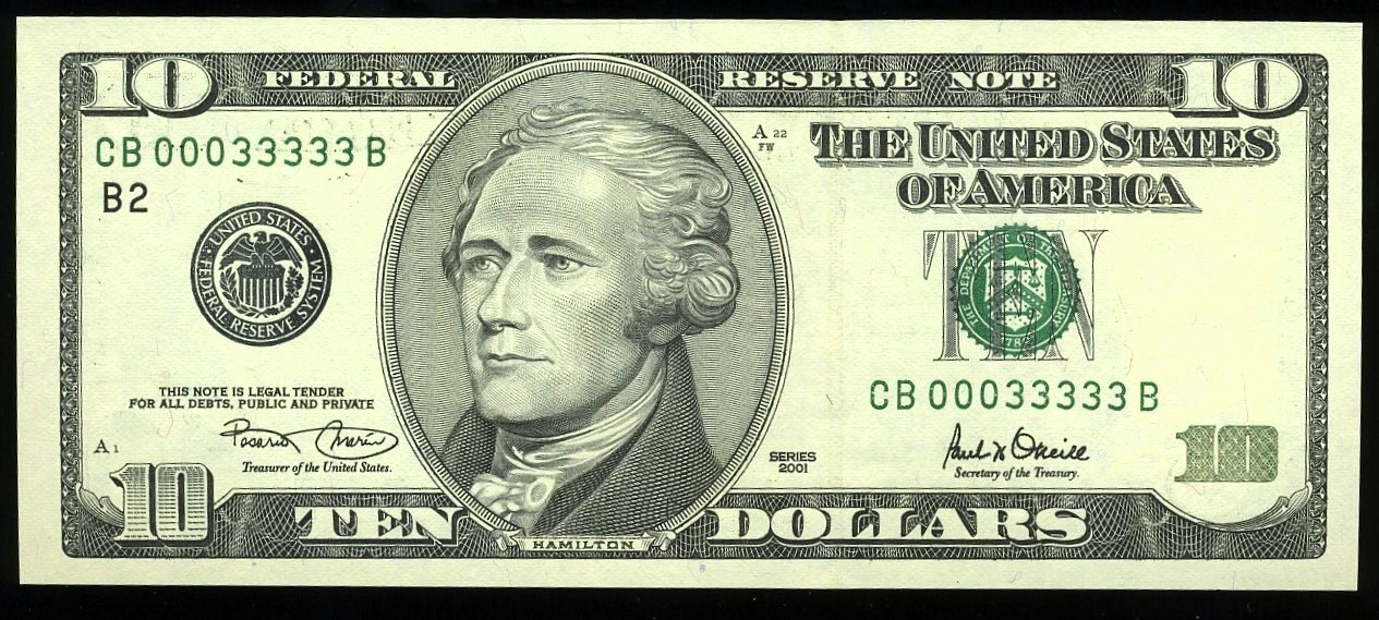 2001 Series Ten Dollar Federal Reserve Note from the New York District, featuring the attractive fancy serial number CB00033333B. This serial presents a straight five 3’s pattern, framed by matching C/B prefix and suffix letters, giving the note a balanced, visually appealing layout. With zeros leading into the run of 3’s, the number carries a near‑solid look, making it especially desirable to collectors of repeating and pattern‑based fancy serials.