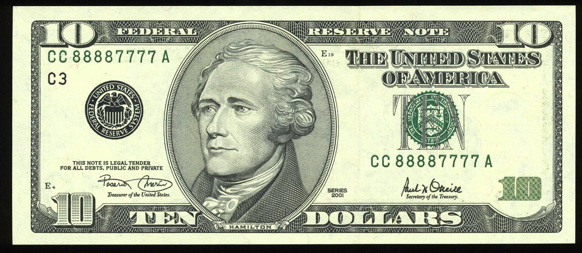 2001 Series Ten‑Dollar Federal Reserve Note from the Philadelphia District featuring a bold quad‑digit fancy serial number: CC88887777A. This is a true 50/50 split—four 8’s followed by four 7’s—an eye‑catching pattern that sits squarely in the premium tier of modern fancy numbers. Graded Gem Uncirculated, this note offers excellent centering, crisp paper originality, and sharp embossing straight out of the pack. The surfaces retain the fresh texture expected from a pack‑pulled Gem, with no distractions to the design or overprint. This issue represents the first‑generation “big head” design for the $10 denomination, a transitional era that continues to gain collector interest as modern fancy‑serial varieties become more actively pursued.