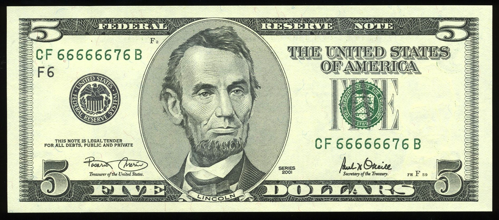 Atlanta District • Seven‑of‑a‑Kind Serial CF66666676A Gem Uncirculated** A striking 2001 Series Five Dollar Federal Reserve Note from the Atlanta District (F‑6) featuring a dramatic seven‑of‑a‑kind fancy serial number: The district letter and number match the serial perfectly, giving this note an added layer of symmetry collectors always appreciate. Just one digit away from a full solid, this is a first‑generation big‑head design with serious visual impact. We grade this example Gem Uncirculated, and it earns that mark with near‑perfect centering, bold embossing, sharp color, and clean, original paper. The surfaces are bright and nearly flawless, and the long run of sixes gives the serial number unmistakable presence. A fantastic modern fancy number with a powerful look — seven matching digits, a district tie‑in, and the early big‑head design all in one note. A standout piece for any fancy‑serial or modern FRN collection.