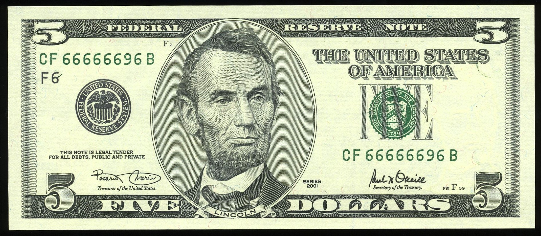 Atlanta District • Seven‑of‑a‑Kind Serial CF66666696A Gem Uncirculated** A striking 2001 Series Five Dollar Federal Reserve Note from the Atlanta District (F‑6) featuring a dramatic seven‑of‑a‑kind fancy serial number: The district letter and number match the serial perfectly, giving this note an added layer of symmetry collectors always appreciate. Just one digit away from a full solid, this is a first‑generation big‑head design with serious visual impact. We grade this example Gem Uncirculated, and it earns that mark with near‑perfect centering, bold embossing, sharp color, and clean, original paper. The surfaces are bright and nearly flawless, and the long run of sixes gives the serial number unmistakable presence. A fantastic modern fancy number with a powerful look — seven matching digits, a district tie‑in, and the early big‑head design all in one note. A standout piece for any fancy‑serial or modern FRN collection.