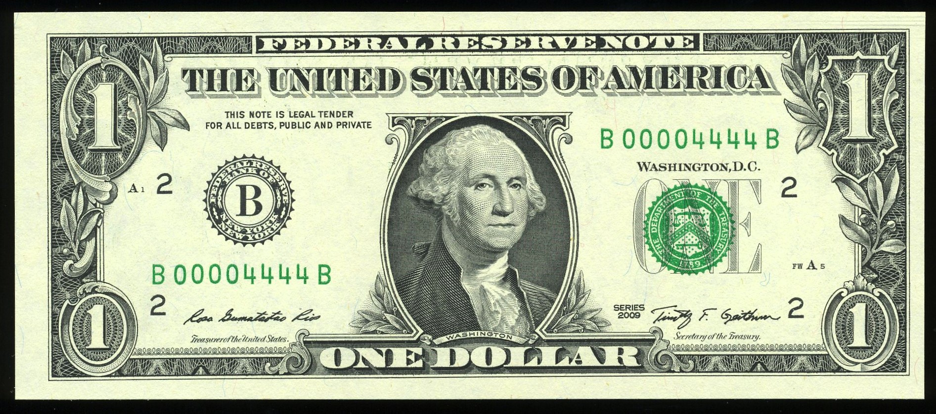 2003A Series One‑Dollar Federal Reserve Note from the New York District (B‑2) featuring a desirable low‑numbered quad‑digit fancy serial: 00004444. With four matching digits supported by a run of leading zeros—and paired with matching B‑B prefix and suffix letters—this note falls squarely into the “mini‑solid” category. Visually bold, highly collectible, and far more affordable than a full solid, it’s a pattern that stands out immediately to fancy‑number specialists. Graded Very choice uncirculated, the note displays fully original paper surfaces, strong embossing, and crisp pack‑fresh texture. The face shows only slight off‑centering, otherwise it would be a gem. Has typical cutting marks on the upper margin. This example was pulled from the fifth brick issued for this block, part of a 96‑million‑note run, making early low‑number fancy patterns like this one especially challenging to locate in high grade. Backing plate #1