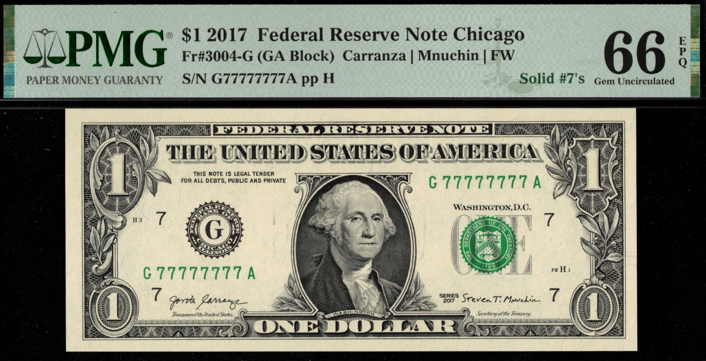 This is the first block printed (G‑A) for the 2017 Series, and the overprint shows additional 7’s embedded within the face design, giving the note an unmistakable visual punch. Certified PMG 66EPQ Gem Uncirculated, it offers everything collectors want: