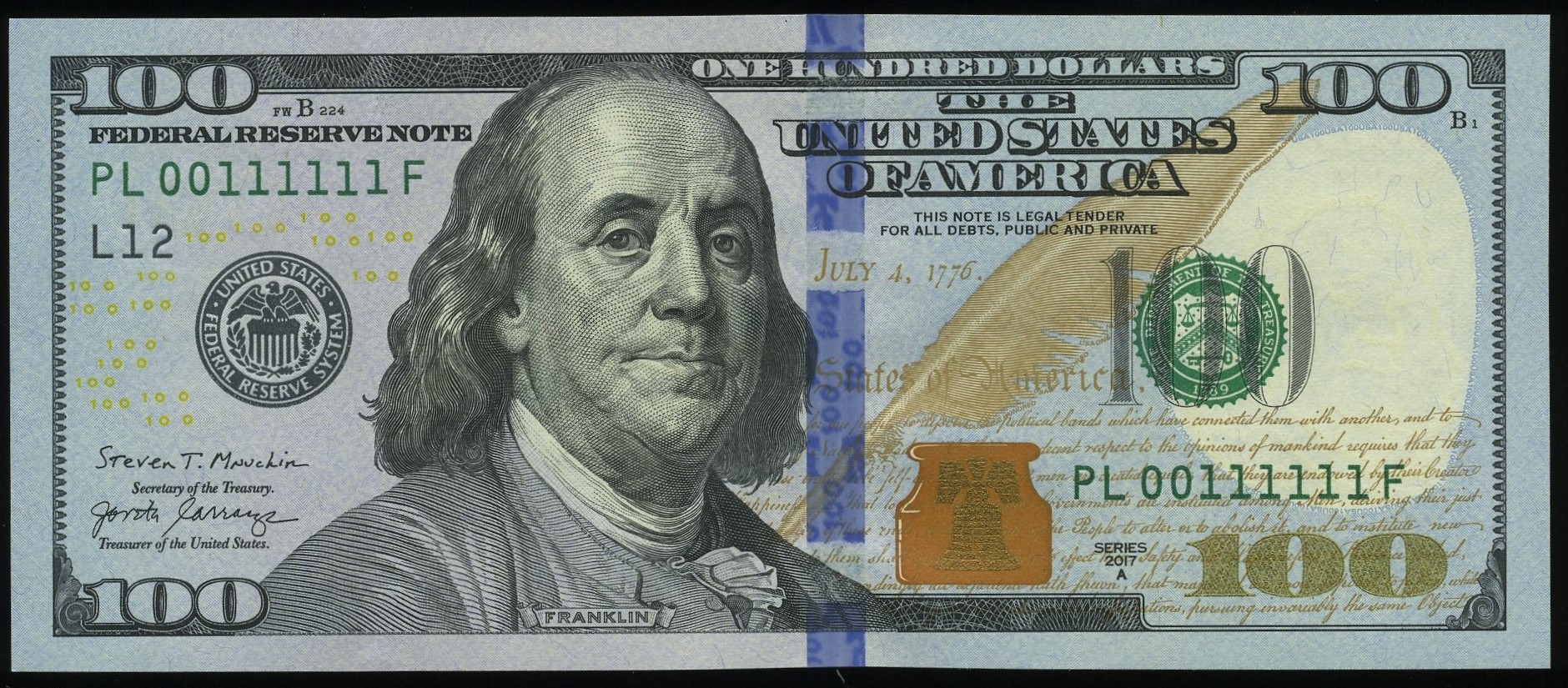 A sharply printed 2017A Series $100 Federal Reserve Note from the San Francisco District featuring the eye‑catching fancy serial PL00111111F. With six straight 1’s, this piece delivers the visual punch of a near‑solid serial number on the newest design type — a pattern that remains extremely tough to find in high grade. This note comes Gem Uncirculated, pulled straight from an original pack, with razor‑sharp corners, deep embossing, and excellent centering. The modern anti‑counterfeit design makes fancy numbers on $100s especially desirable, and examples approaching solid‑digit patterns have been gaining strong traction among advanced collectors. While not a full solid (which now commands $6,000+ in Gem), this “six‑ones” serial offers tremendous value and display appeal at a fraction of that price.