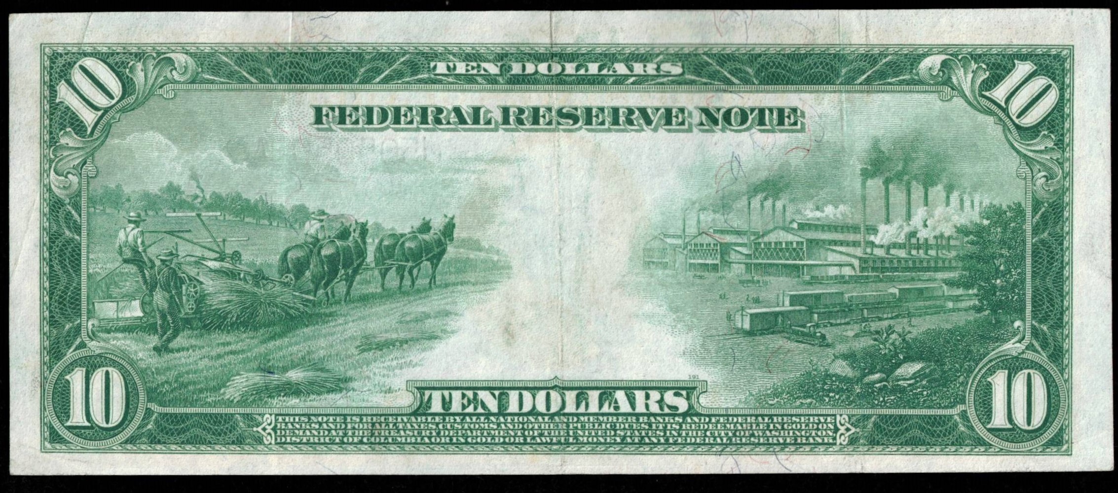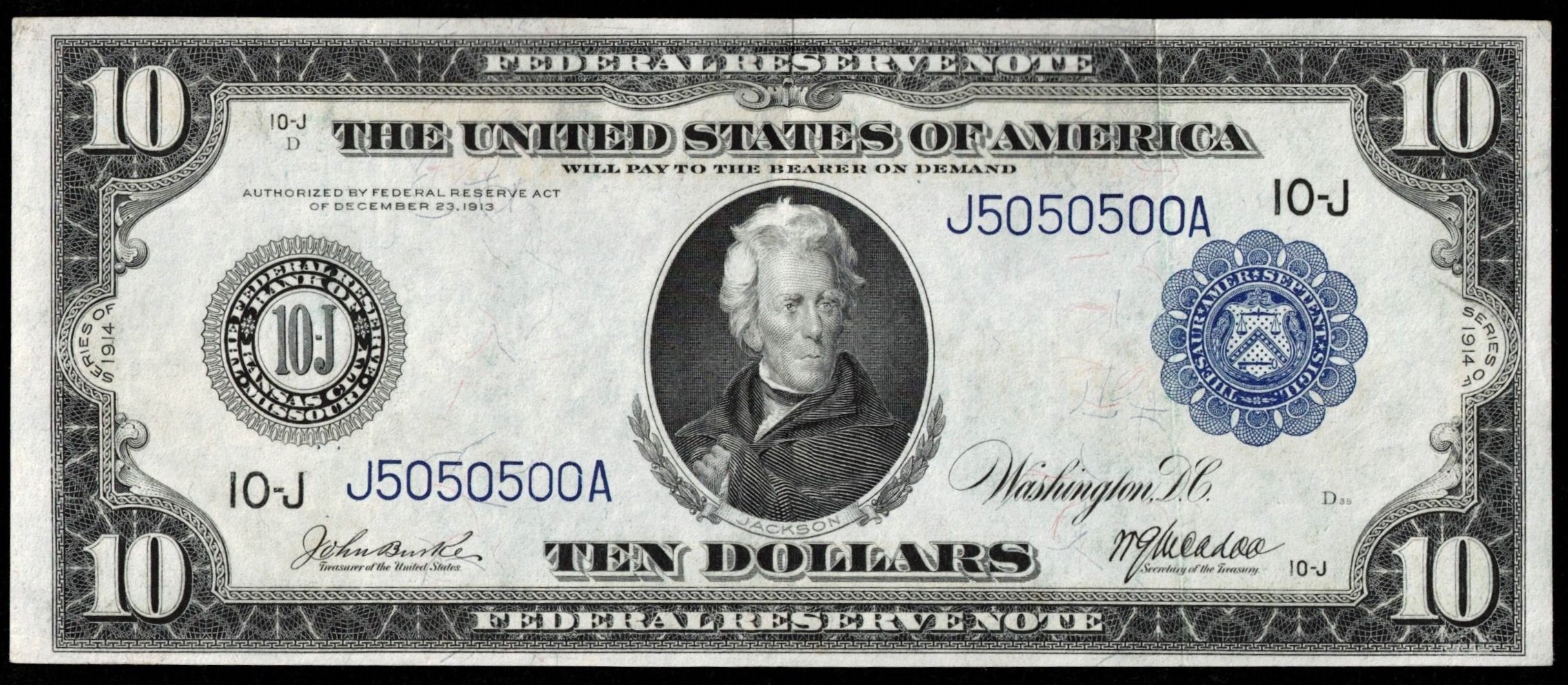 Handsome FR‑940 — a 1914 Series $10 Federal Reserve Note from the Kansas City District, featuring the striking binary serial J5050500A, composed entirely of 0s and 5s. This early large‑size Federal Reserve Note remains bright and attractive, showing three light folds and only the slightest handling. We grade it Extra Fine, with strong eye appeal and notably clean centering for the issue. The Burke–McAdoo signatures add to its period charm, and the fancy binary serial elevates it well above typical circulated examples. Binary serials on large‑size FRNs are actively pursued, and Kansas City notes with this level of originality and visual punch are not easy to find. A sharp, collector‑worthy example that stands out immediately in any type or fancy‑number set.
