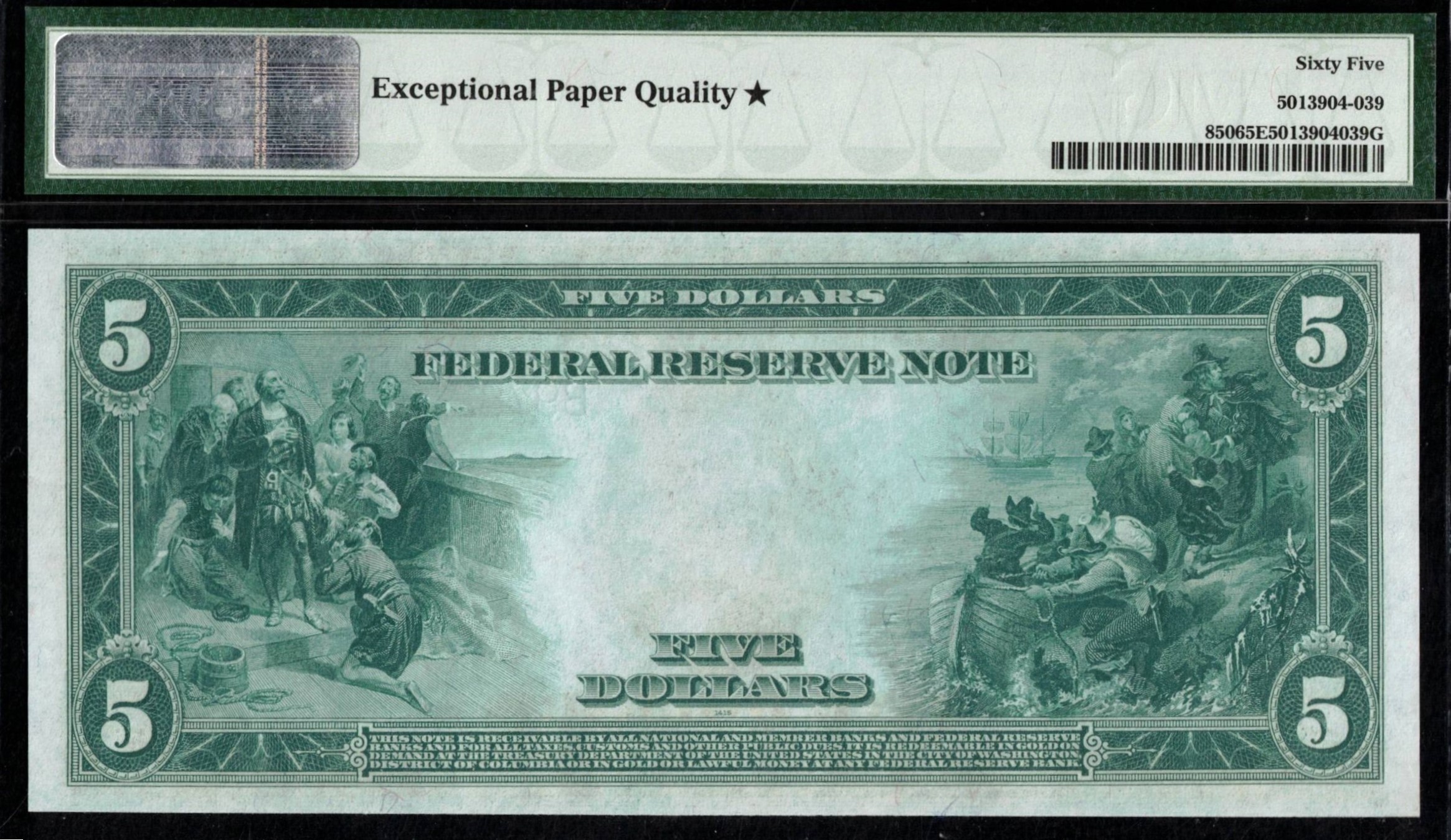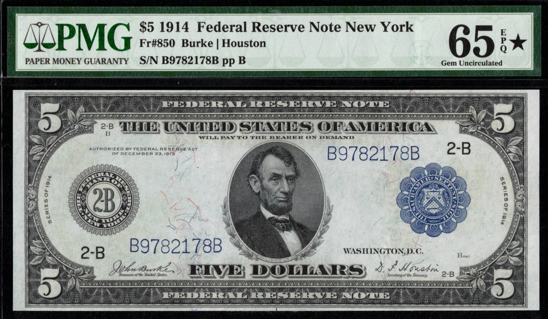 Fr-850 1914 Series Five Dollar Federal Reserve Note from the New York District. Third-party graded P.M.G #65EPQ star, Gem Uncirculated with exceptional paper quality. A bright note with sharp inks, centered very well-perfect fit for the type set. Signatures are Burke-Houston. Just two are graded with the star designation qualifier on the holder in this grade. One higher in 66Q, just four total in grade higher.
