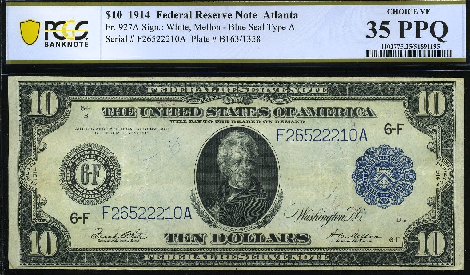 This Fr.‑927A 1914 $10 Federal Reserve Note from the Atlanta District (Serial F26522210A) is an attractive early‑series example that still retains strong originality and bold ink presence. The note shows three classic wallet‑style folds, typical of honest circulation, yet the design elements remain crisp with excellent detail across both face and back.