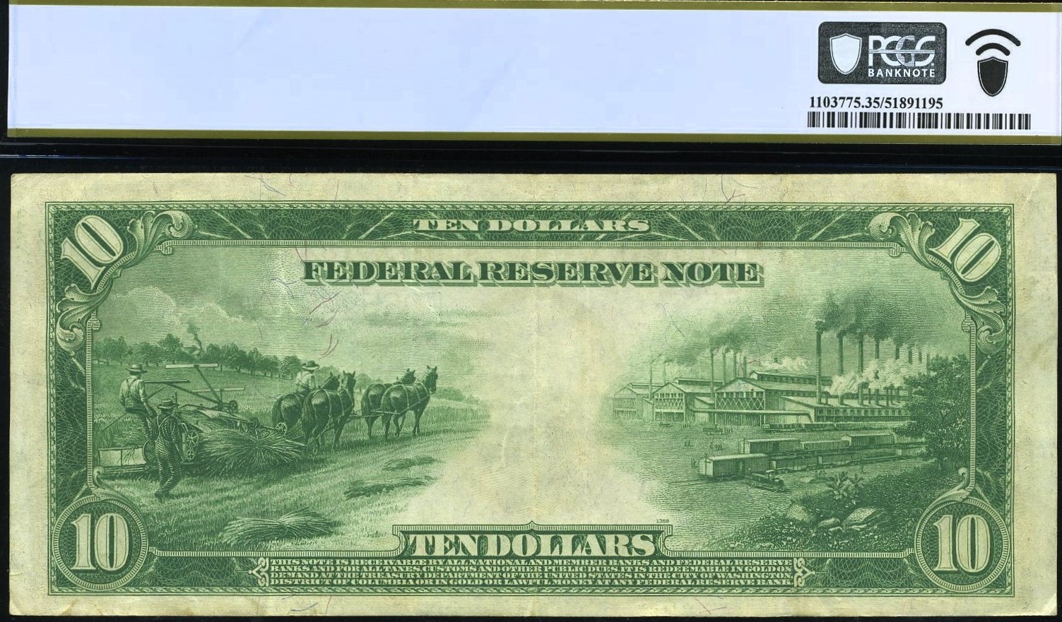 A solid mid‑grade example of the iconic 1914 $10 Federal Reserve design, offering originality, color, and eye appeal. A strong choice for collectors seeking a premium VF with PPQ certification from the early Federal Reserve era.