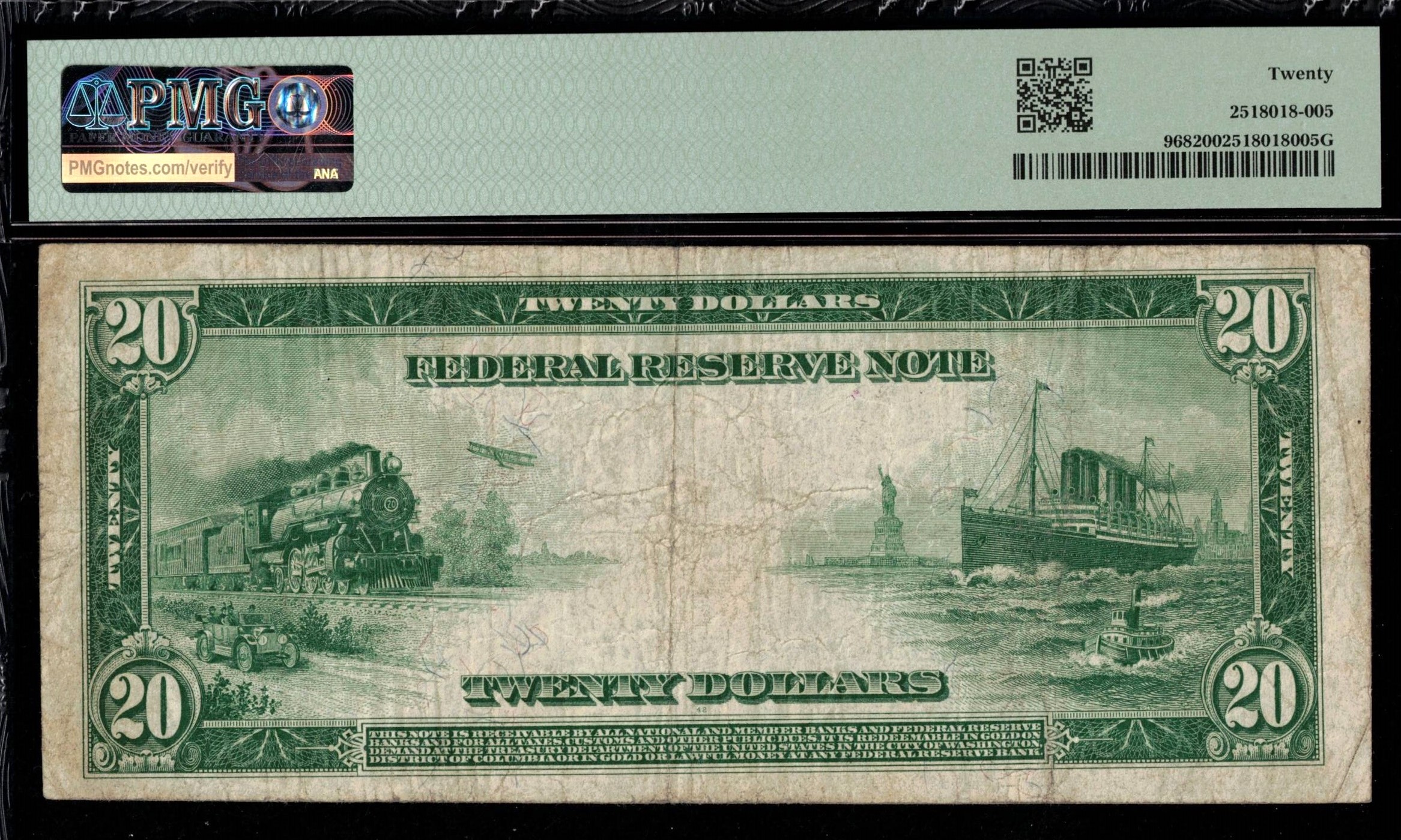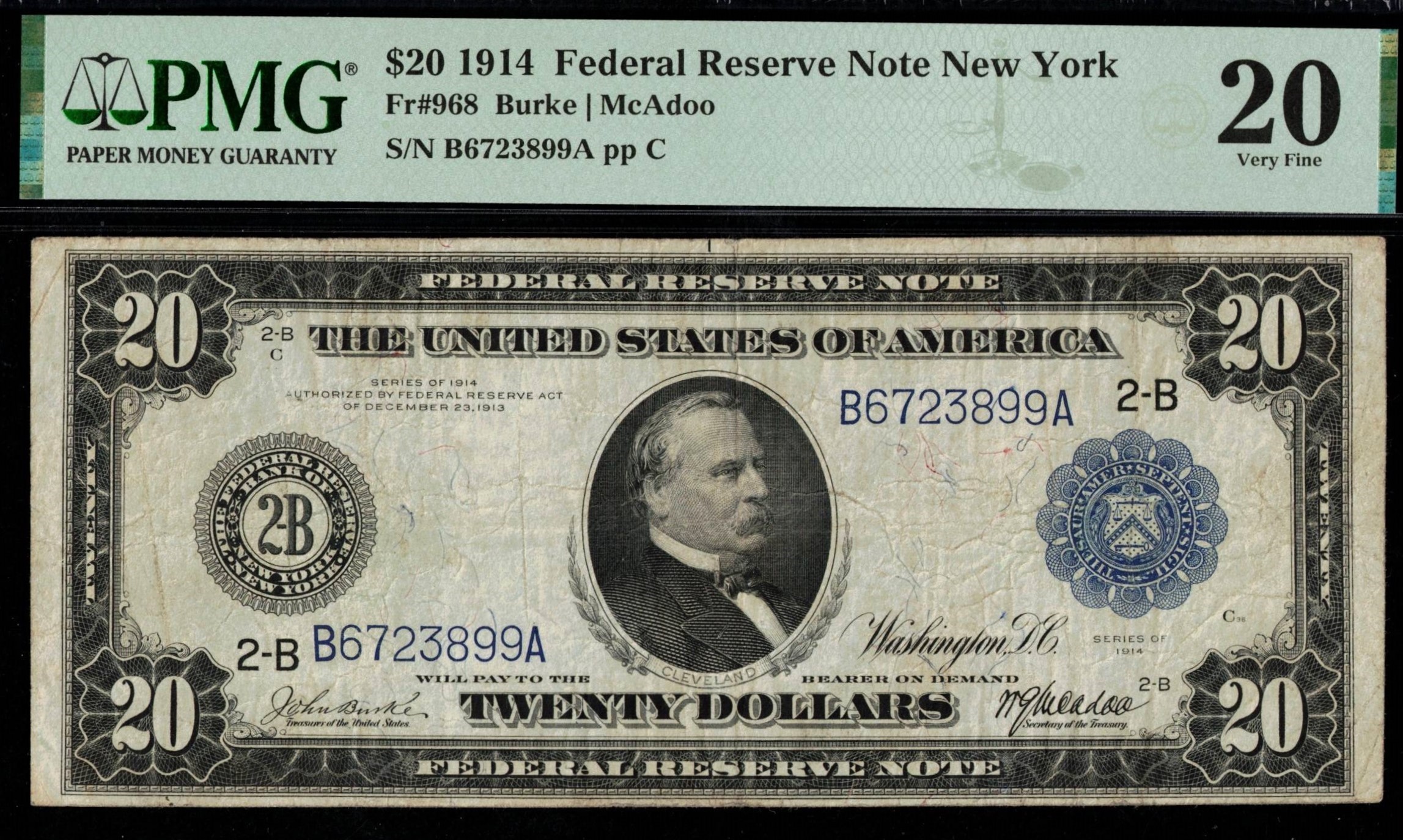 This Fr-968-B 1914 Series Twenty Dollar Federal Reserve Note from the New York District is third-party graded by P.M.G. as #20 in very fine condition, with no comments. It’s a well-centered, untattered, serial number B6723899A, offering an affordable option compared to an uncirculated example. It features the signatures of Burke and McAdoo.