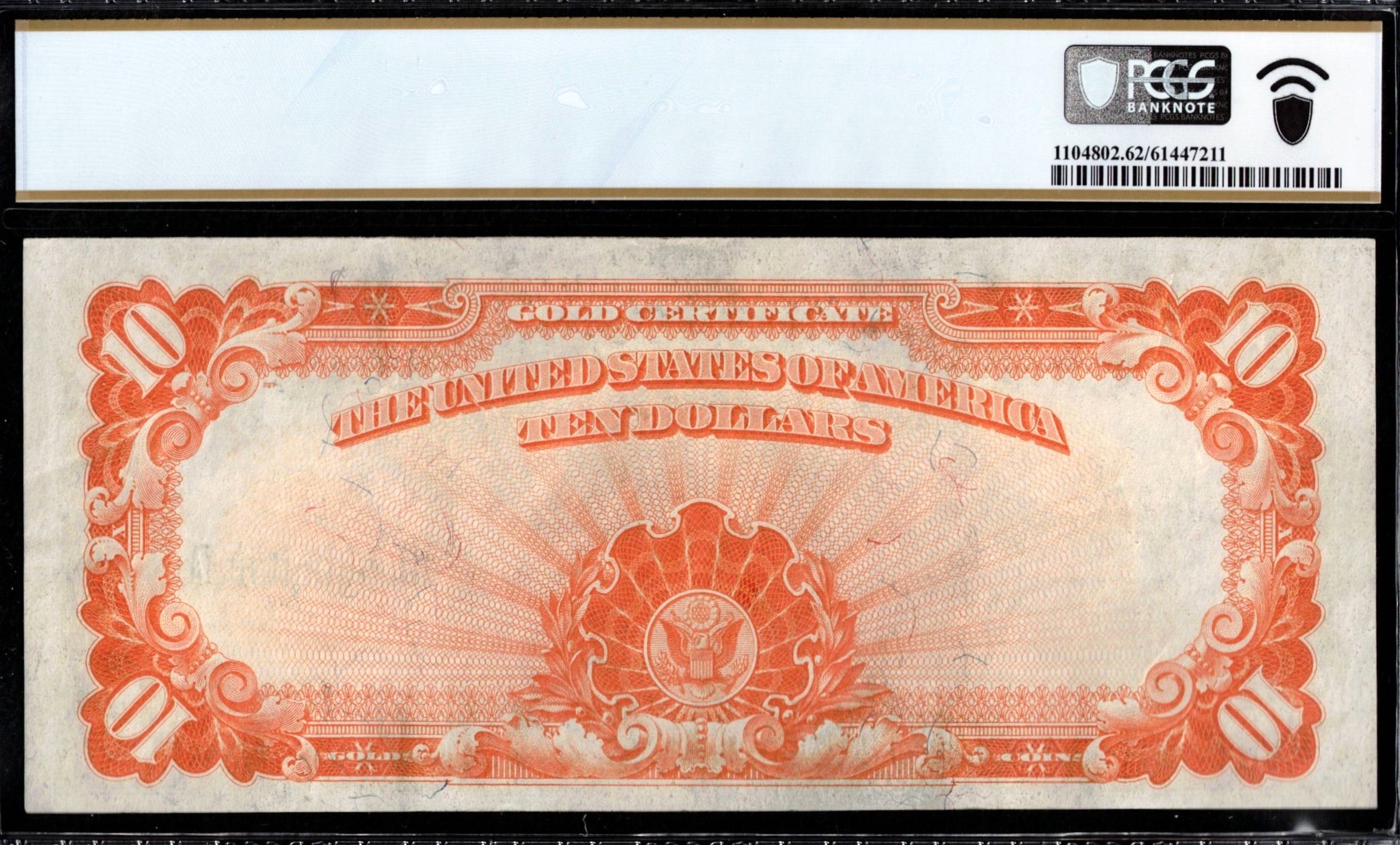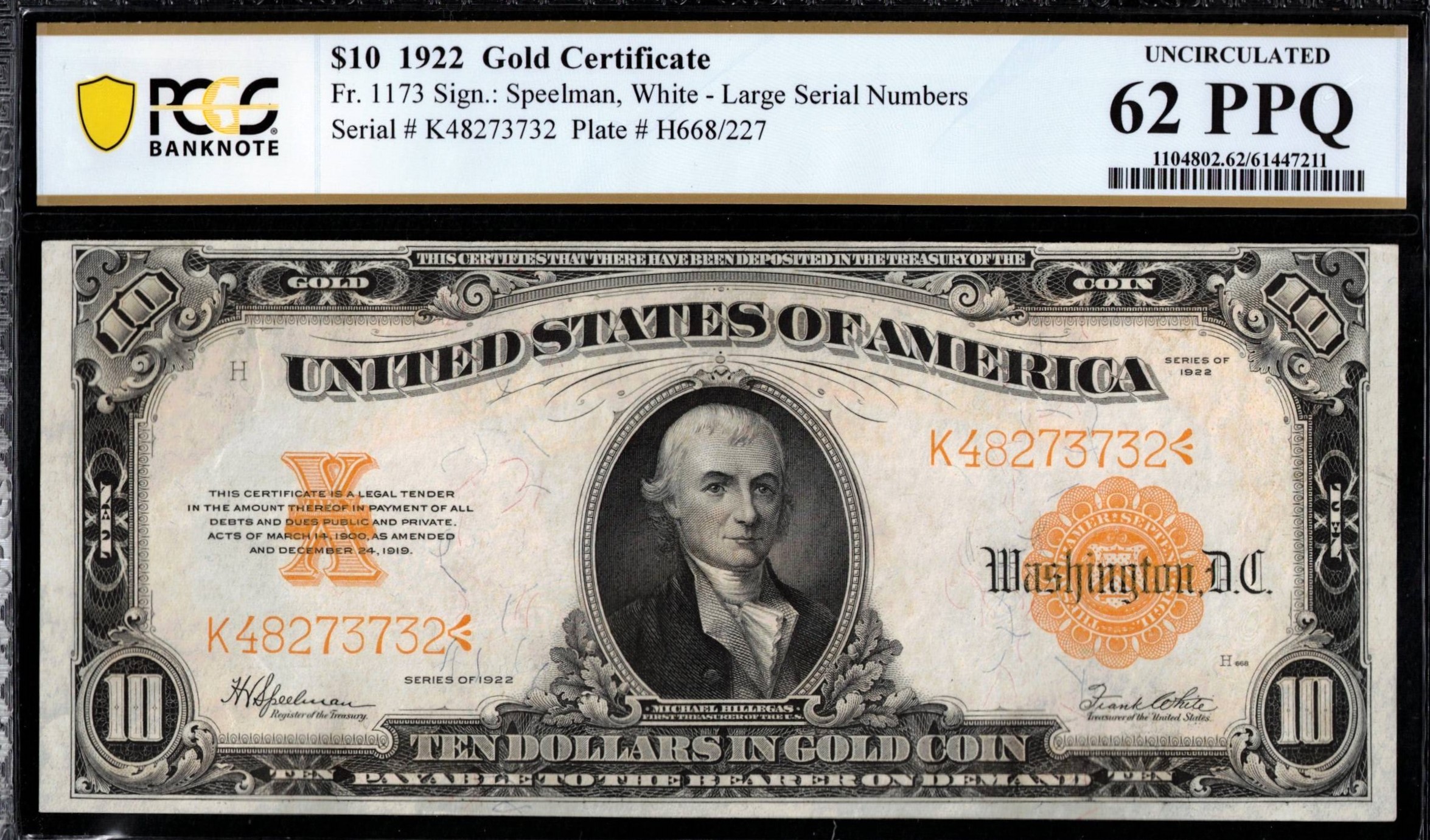 FR-1173-L, Large Serial Number Variety, K48273732< is a 1922 Series Ten Dollar Gold Certificate, third-party graded P.C.G.S #62PPQ Crisp Uncirculated with premium paper quality. It features bright white paper, with a high contrast of an orange across the back of the note. We managed to acquire two from the same source, and remarkably, both received identical grades. Signatures are Speelman-White.