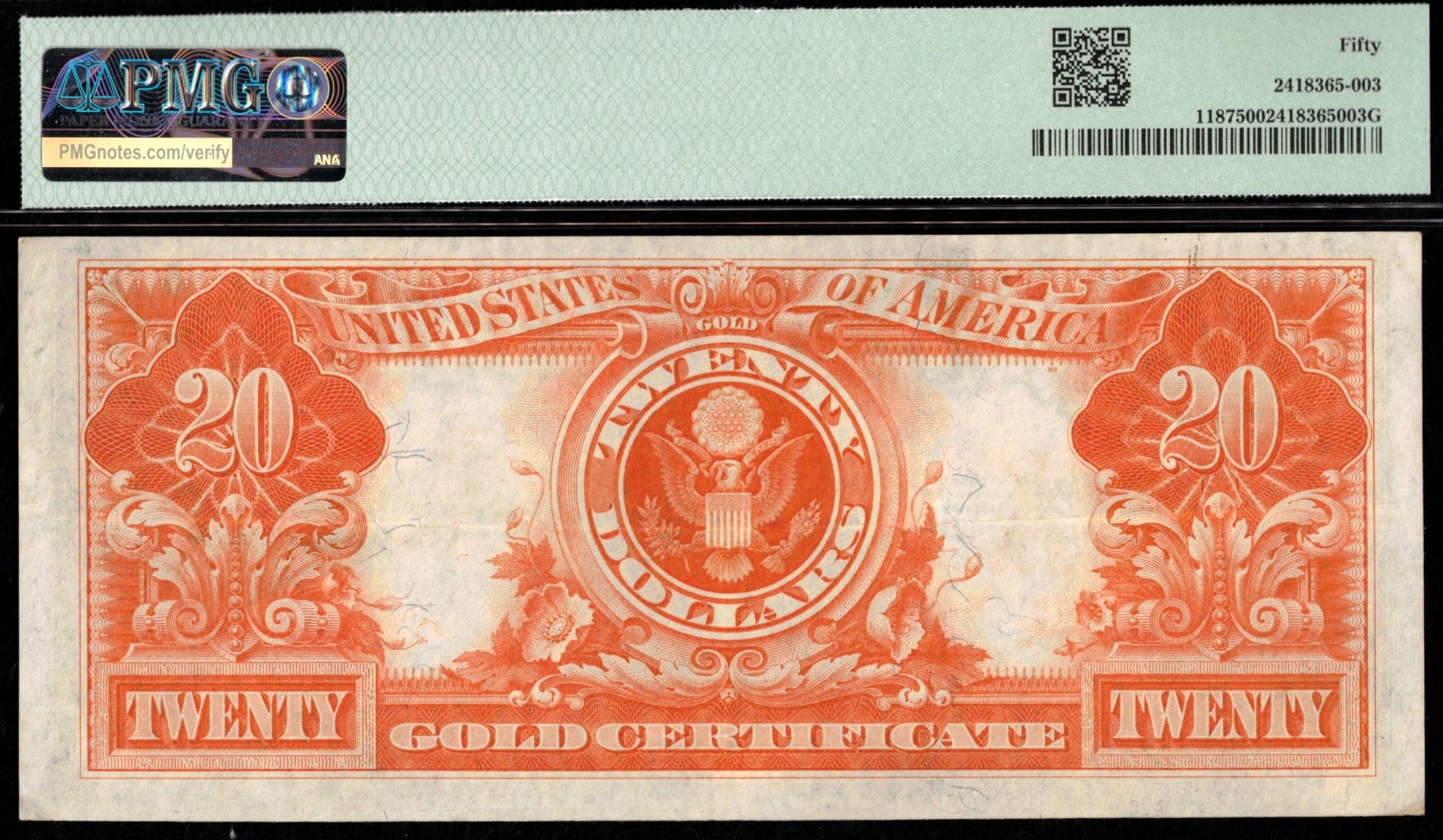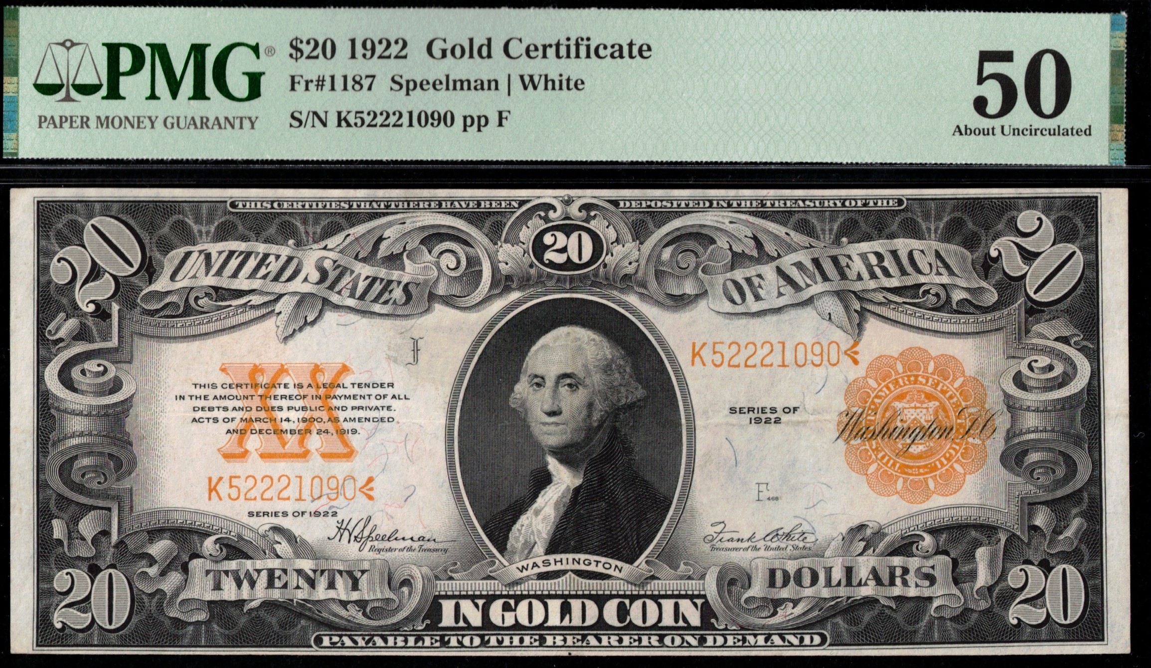Fr-1187 1922 Series Twenty Dollar Gold Certificate Serial K52221090<. It has that uncirculated appearance, but it’s not… it’s third-party graded P.M.G. #50, about uncirculated. The back of the note has a super bold orange color. Sharp looking note…. this denomination trends at the $3000.00 plus mark in #64 and higher. Here’s one just under that grade level & of course price. Signatures are Speelman/White.