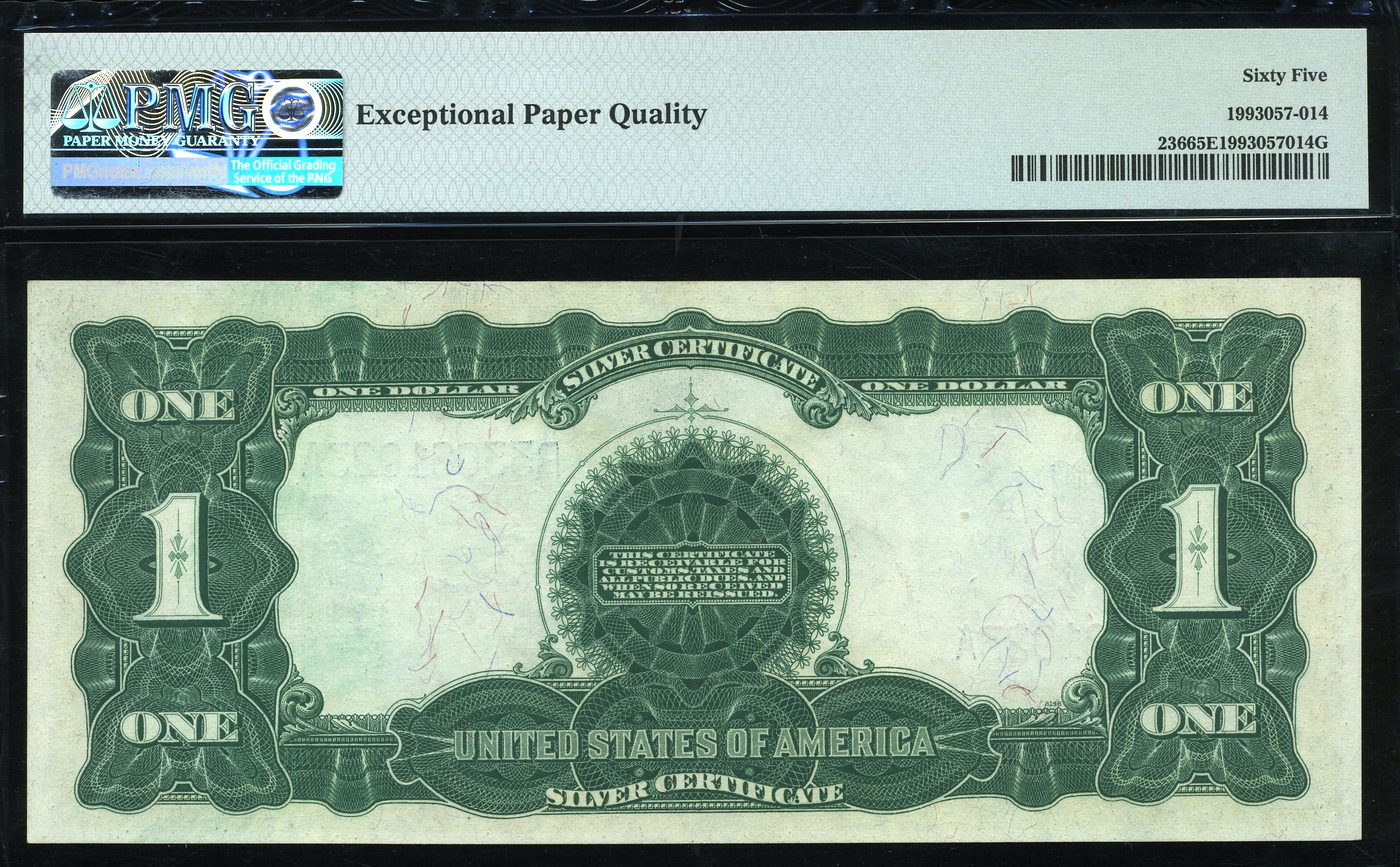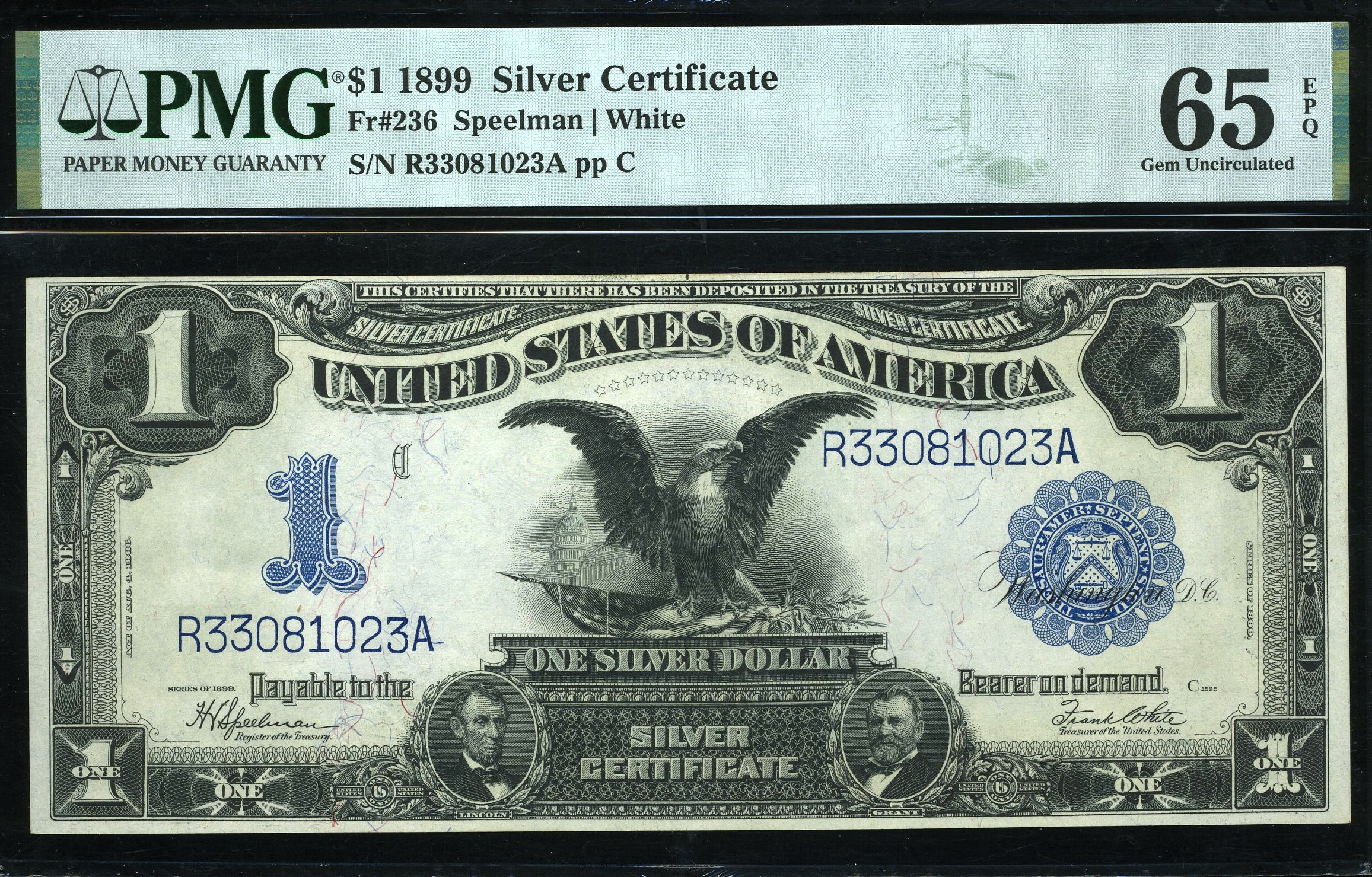PMG 65EPQ Gem Uncirculated Black Eagle — FR‑236 1899 $1 Silver Certificate with bright white paper, decent centering, and fully original EPQ surfaces. Serial R33 81023A, Speelman/White signatures, and C‑plate position (third note from the top). A crisp, pack‑fresh Gem example of this iconic design.