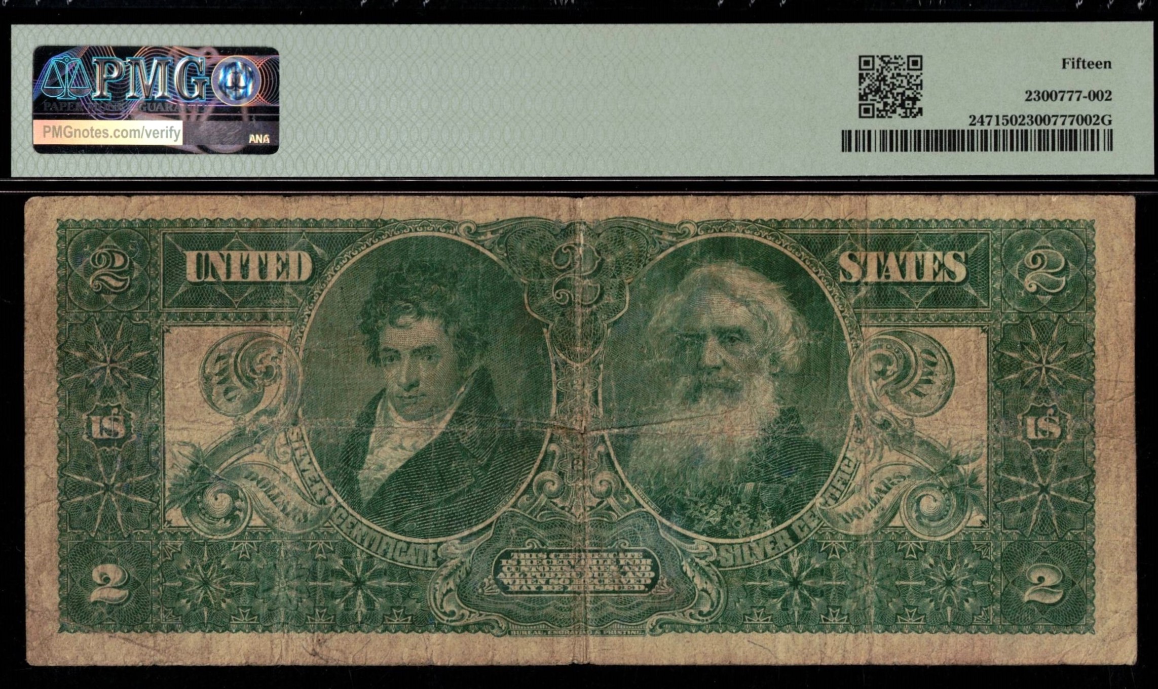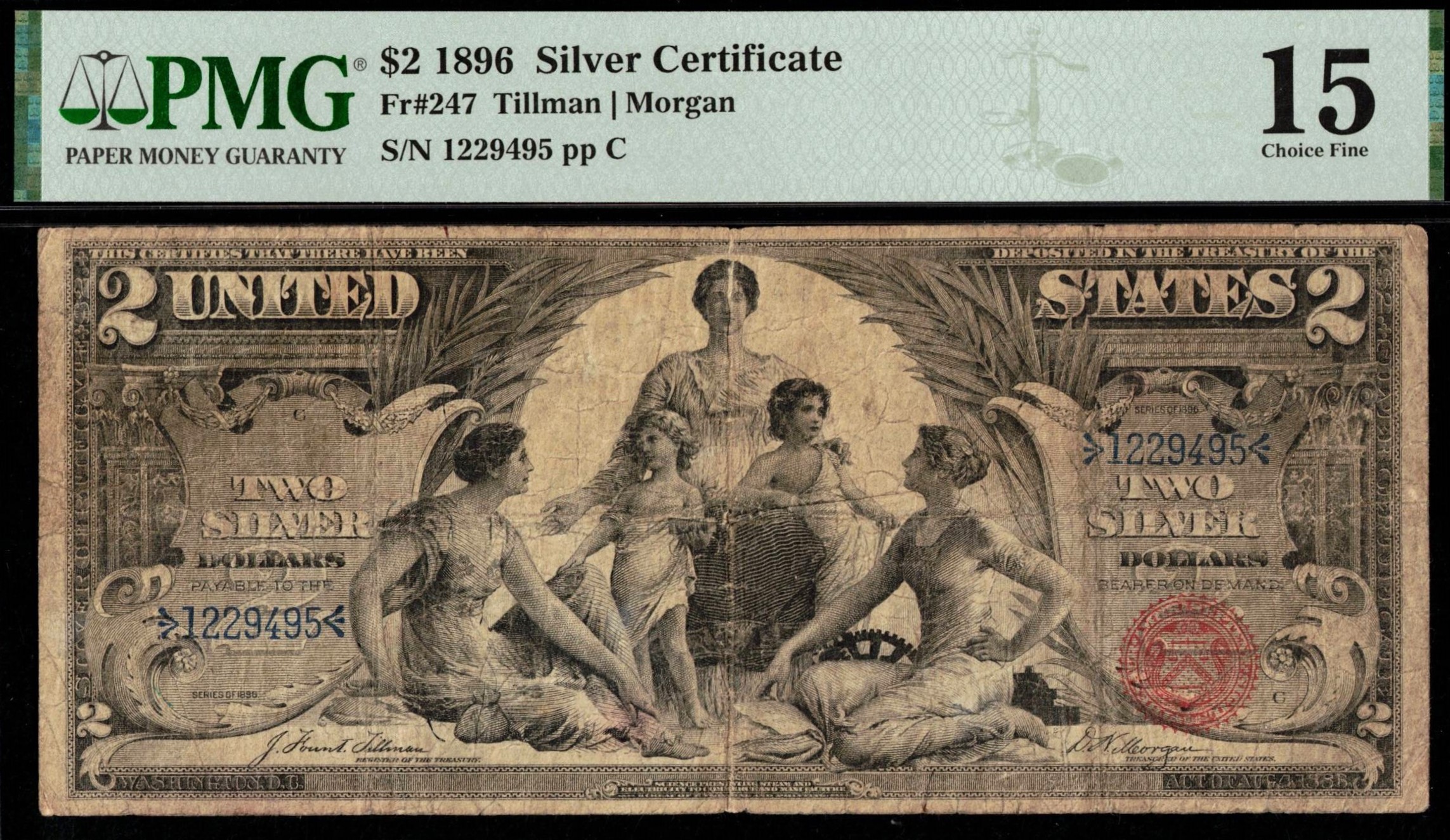 FR‑247 1896 Series $2 Silver Certificate — the iconic Educational Series — remains one of the most artistically celebrated issues in U.S. paper money. Issued in $1, $2, and $5 denominations, these notes are prized for their allegorical designs and short-lived production. This example is a well-circulated survivor, graded PMG Fine 15 with no comments on the holder. While solidly circulated, the note retains good body and integrity, with honest wear consistent with its grade. Light soiling is present, but the paper remains intact and stable, making it an attractive mid-grade representative of this classic series. Signed Tillman–Morgan, this note offers collectors an affordable entry point into the Educational Series, especially when compared to the steep premiums commanded by higher-grade or uncirculated examples. For collectors seeking historical significance, visual appeal, and value-conscious pricing, this Fine-grade example checks all the right boxes. A strong opportunity to own a genuine piece of late‑19th‑century American currency artistry without the uncirculated price tag.