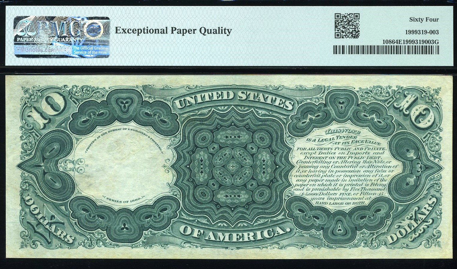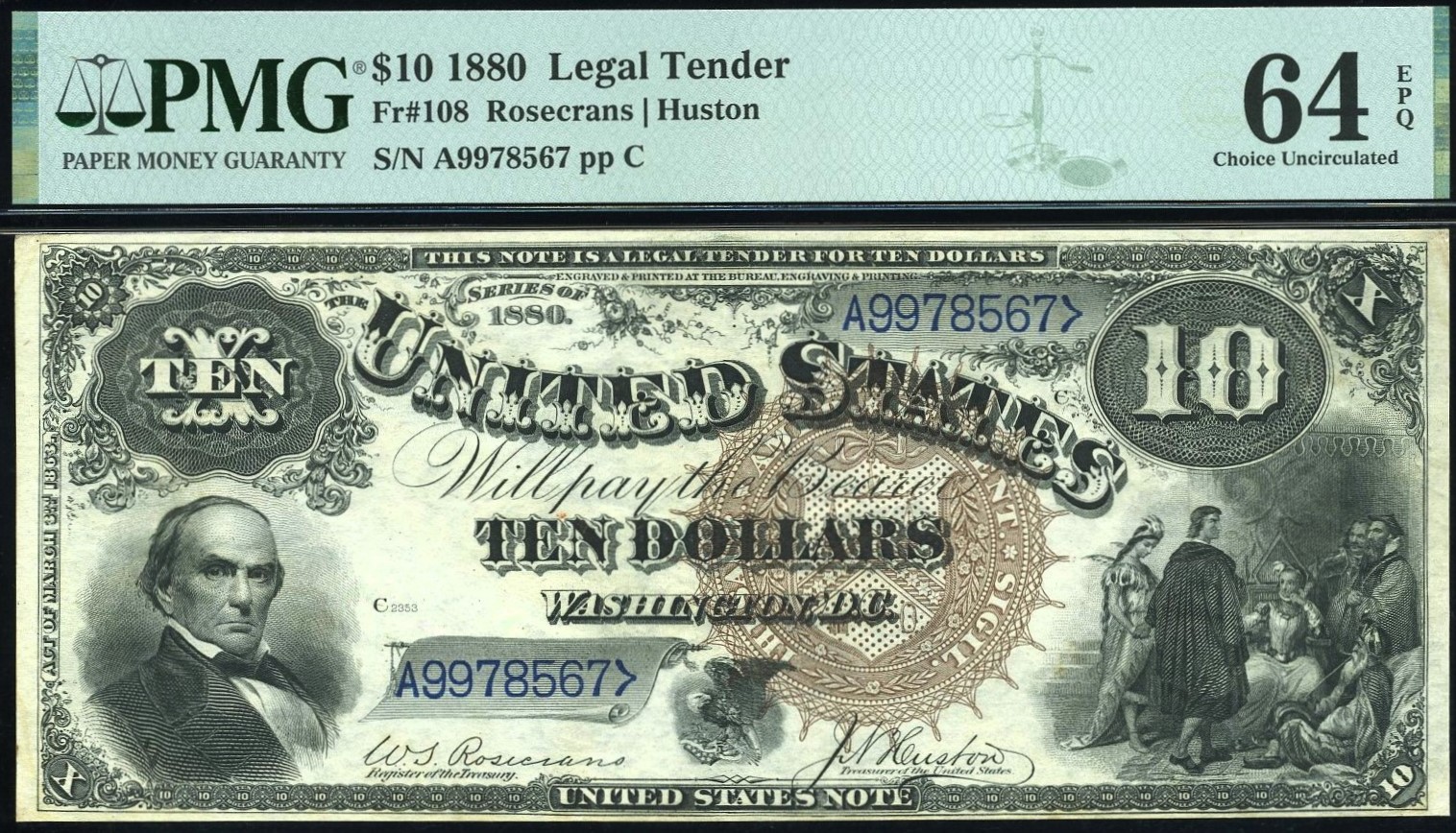 This is a sharply detailed example of the FR‑108 1880 Ten Dollar Legal Tender, carrying serial A9978567 and certified PMG 64EPQ Choice Uncirculated with Exceptional Paper Quality. Only 10 notes sit at this grade level in the PMG population, with just six graded higher, making this a legitimately scarce opportunity for collectors who track condition rarity.