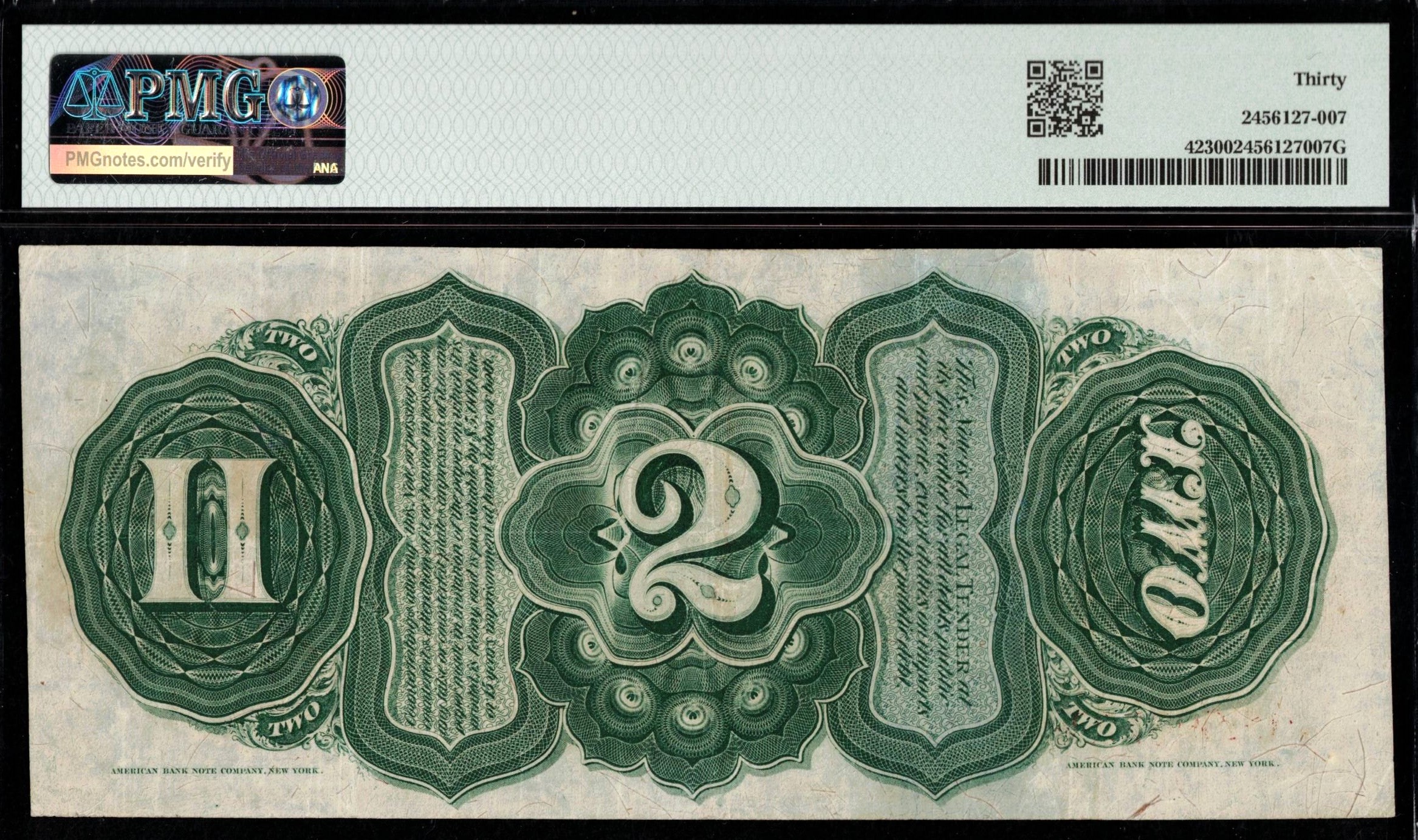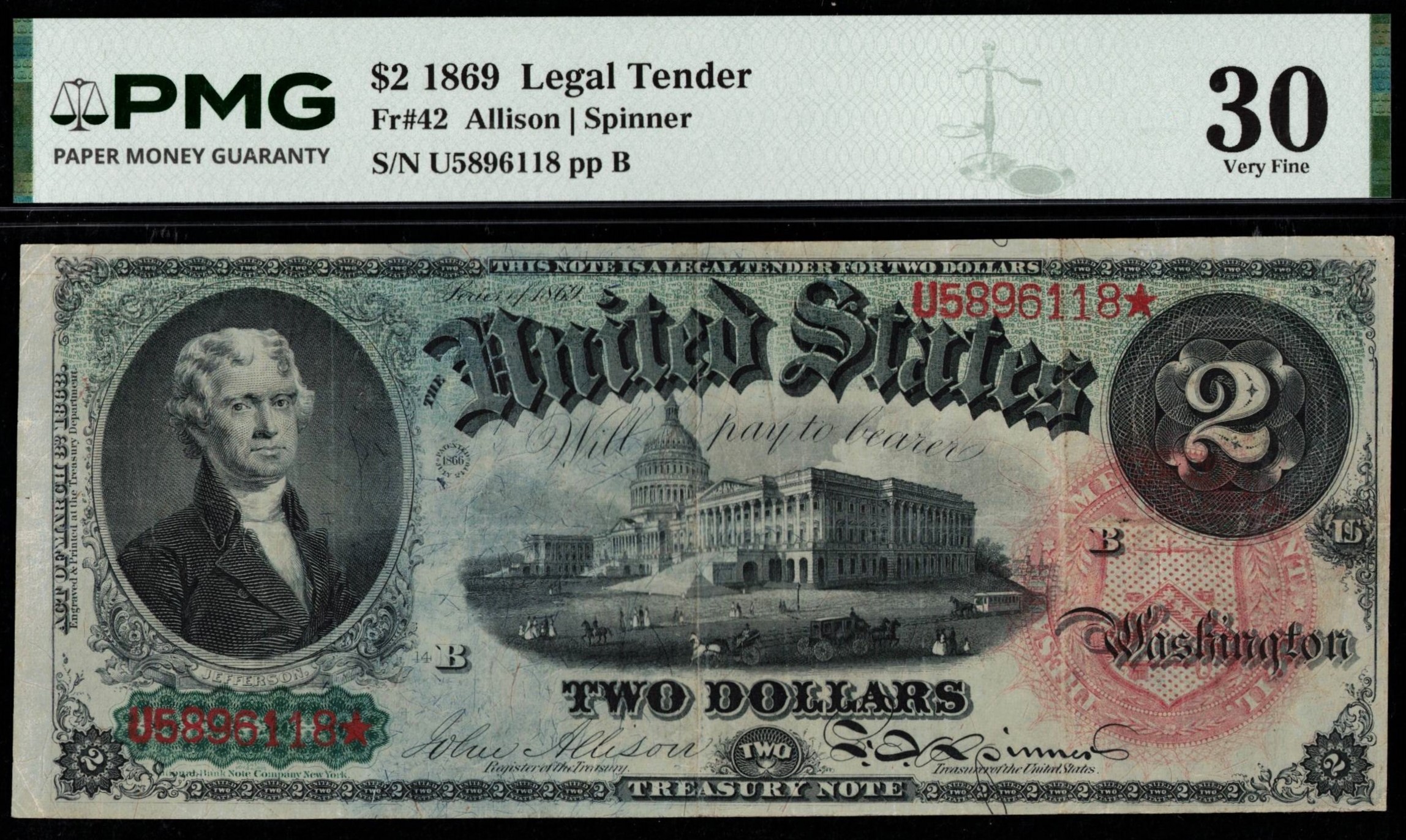 This classic Fr.‑42 1869 Series Two Dollar Legal Tender Note, better known to collectors as the “Rainbow”, is one of the most visually distinctive notes of the 19th century. The issue is celebrated for its vibrant red, green, and blue coloration embedded within the paper, a design feature that set it apart from earlier Legal Tender notes and remains highly admired today. This example has been third‑party graded by PMG as 30, placing it solidly in the Very Fine to Extra Fine range, with no comments on the holder. The note displays decent centering and strong, original color, with the rainbow hues remaining bold and attractive. Three noticeable folds are present, consistent with the assigned grade. Despite its circulation, this note retains excellent eye appeal and presents as a clean, honest mid‑grade example. It offers collectors the opportunity to own one of the most iconic Legal Tender designs without the substantial premium commanded by uncirculated or high‑end examples.