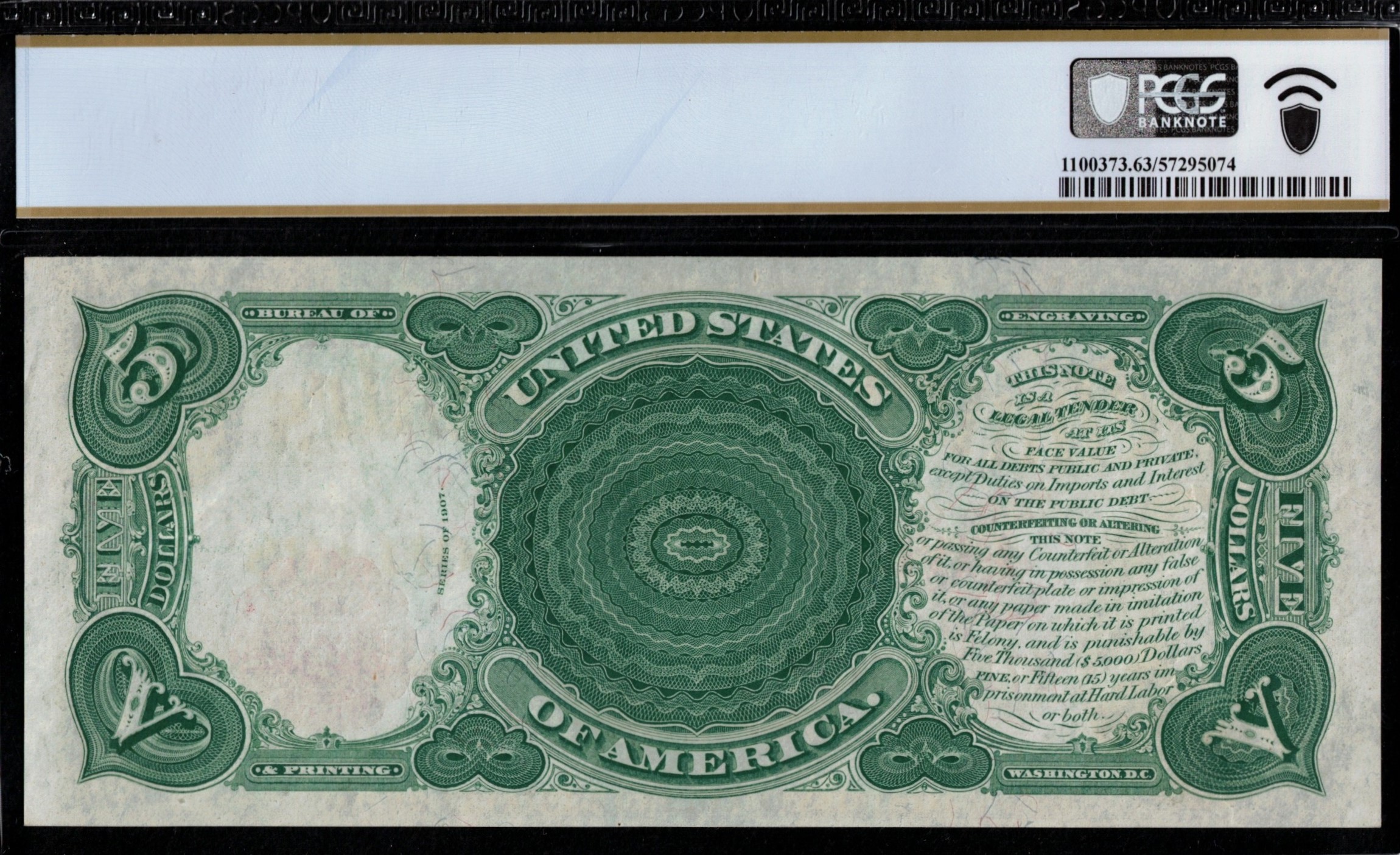 Fr-88 1907 Series Five Dollar Legal Tender, better known as the “Woodchopper”. Bright, well-detailed, sharp inks throughout on this example. Third-party graded P.C.G.S #63PPQ Choice Uncirculated with premium paper quality. Excellent type note fit to the collection. PLATE #C E71752579<  Signatures are Teehee–Burke.