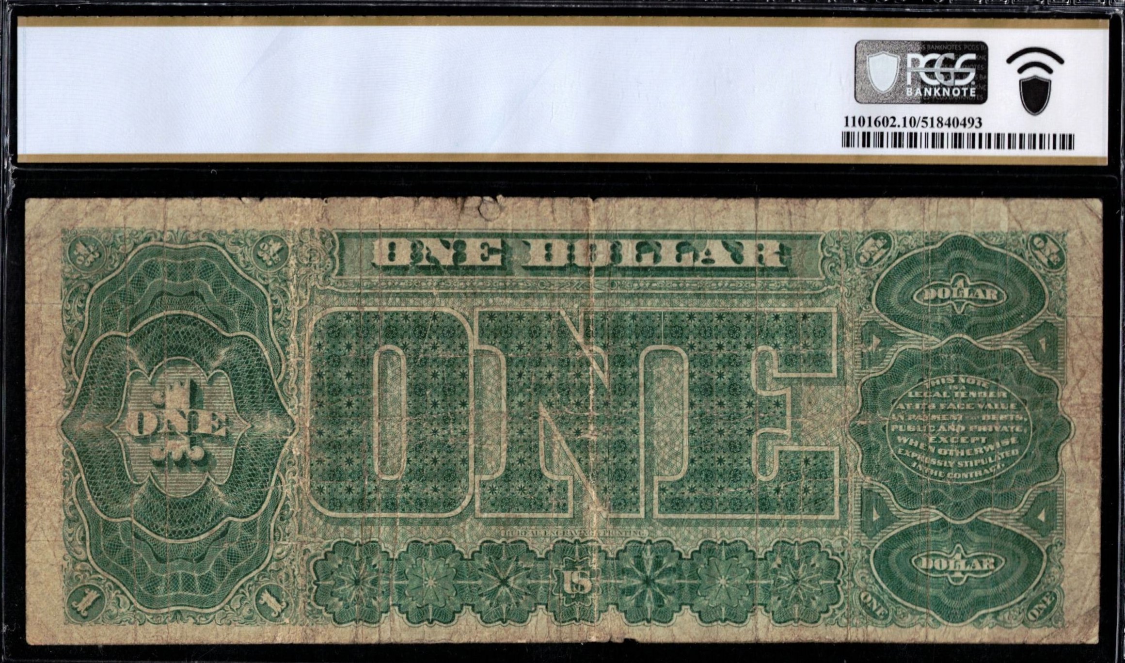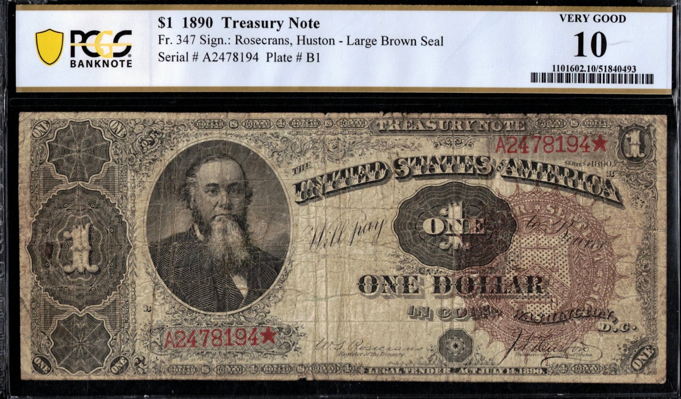 Fr-347 1890 Series One Dollar Treasury Note, or “Coin Note” Serial A2478194. This example, plate #1 with the ornate back design, is well-circulated and graded P.C.G.S #10 Very Good. It features a large portrait of Stanton alongside a prominent brown spiked seal. A nice filler piece for this highly sought-after note, with signatures from Rosecrans and Huston.