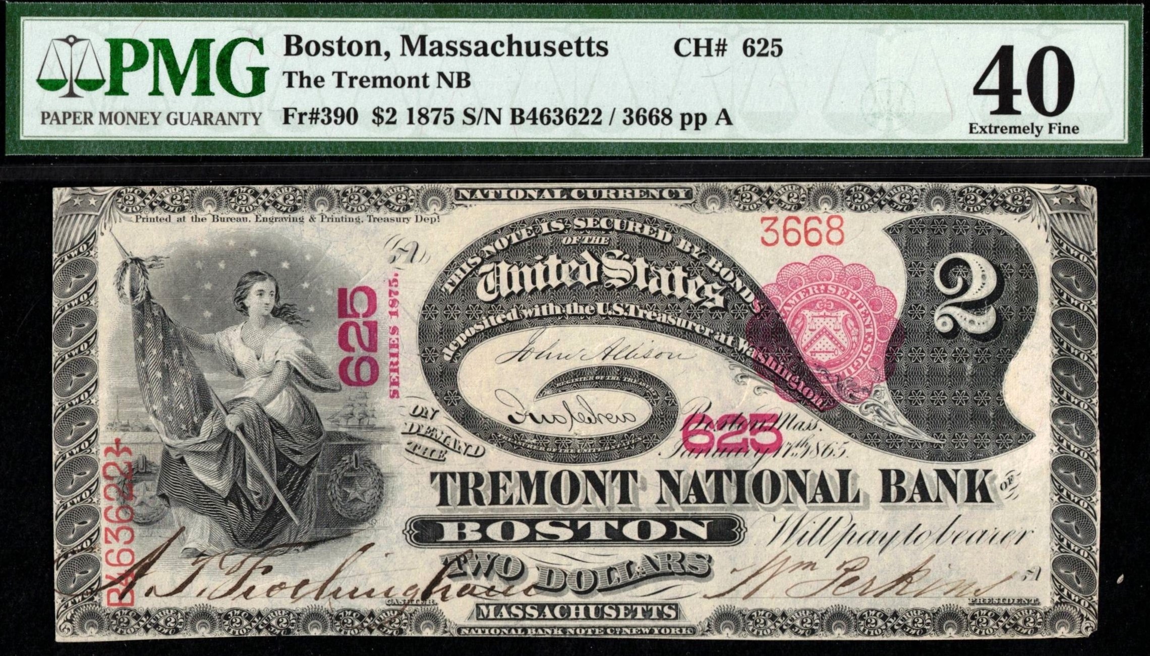 1875 Series $2 LAZY DUECE TREMONT NATIONAL BANK OF BOSTON, MASSACHUSETTS. SERIAL 3668
