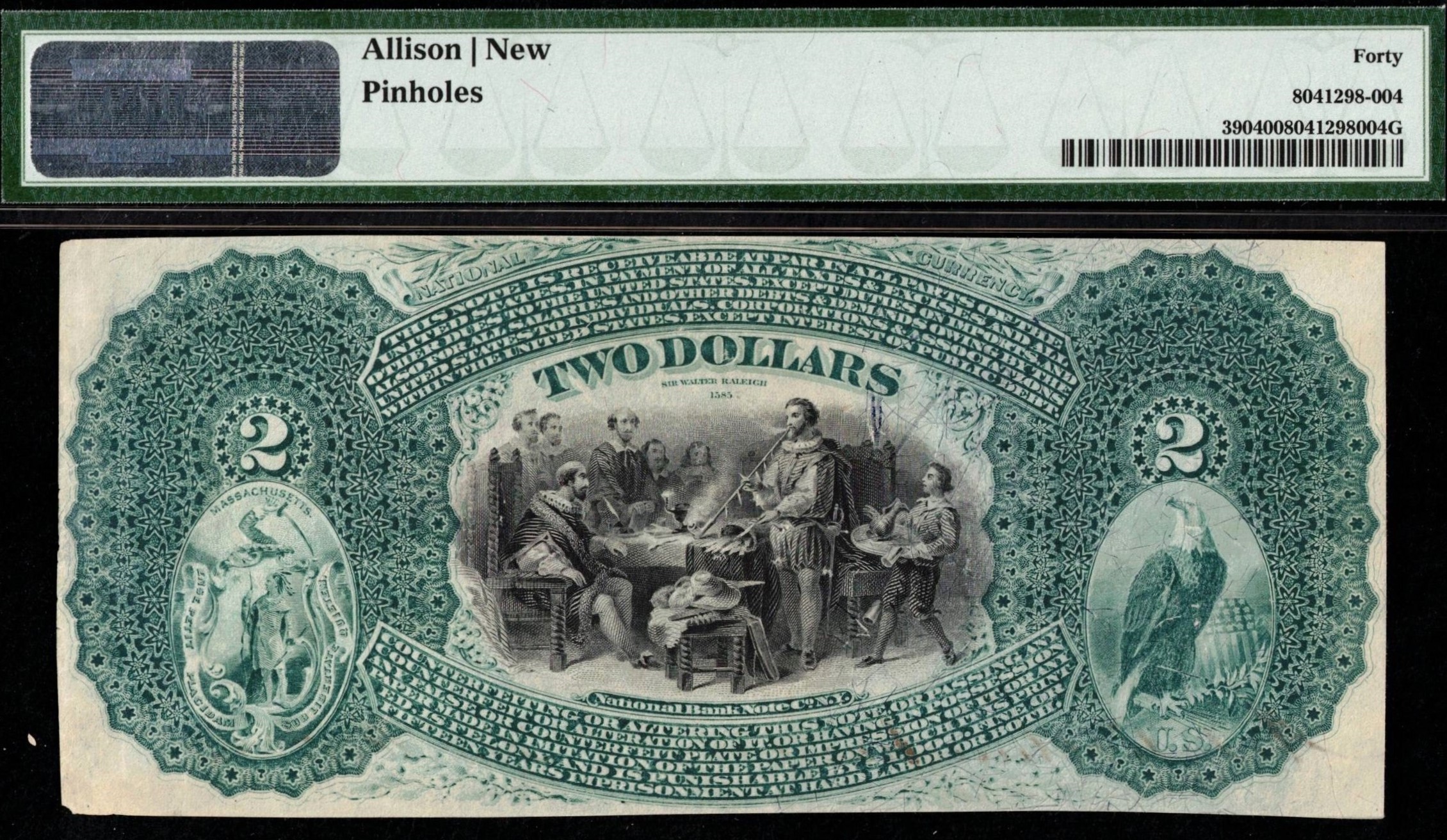 Third-party graded P.C.G.S #40 Extra Fine, showcasing vibrant inks and a distinct red seal overprint. The “New England Trim” is not a flaw but a historical reflection of the region’s banking practices. The margins have been trimmed; the $2 Lazy Deuce term refers to the practice of bank employees trimming note edges to fit cash boxes originally designed for obsolete notes. This was a common practice in Boston and Massachusetts, extending to banks as far as Bangor, Maine, and Upstate New York. Three pinholes are present in the center of this example. Only seven $2 Lazy Deuce Nationals are documented for this charter out of the 27 Large Size notes in total. Census records indicate just two 1875 Series have been sold since 2011. Sharp-looking note for being mid-grade.