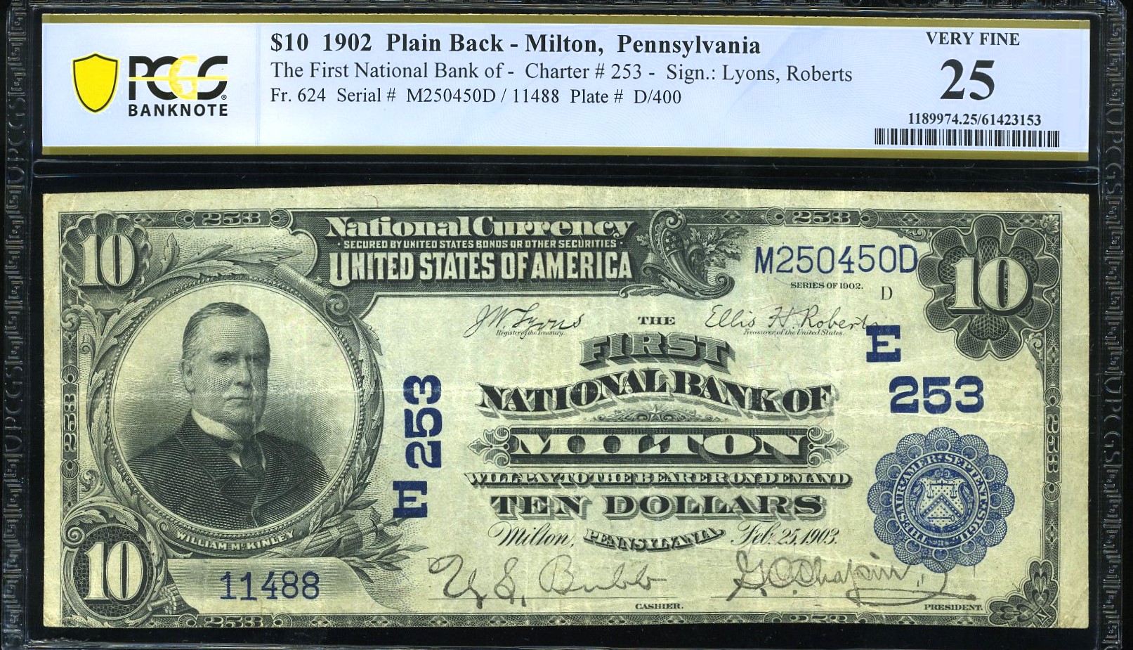 A scarce 1902 $10 Plain Back from The First National Bank of Milton, Pennsylvania, operating under Charter #253 and bearing Serial 11488. Large‑size notes from Milton are genuinely tough, with only a small handful known across all grades—making this an important opportunity for collectors of Pennsylvania nationals.