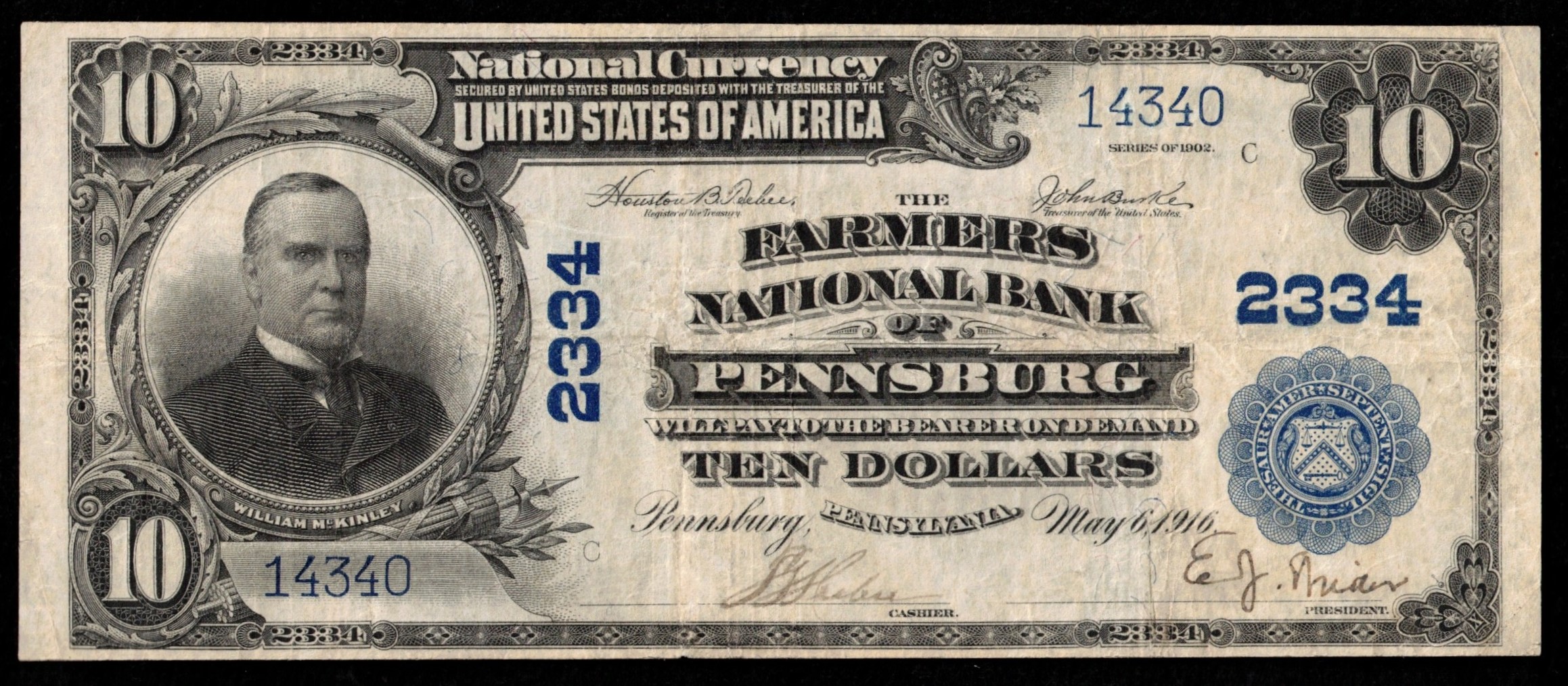 1902 Series $10 THE FARMERS NATIONAL BANK OF PENNSBURG, PENNSYLVANIA. SERIAL 14340