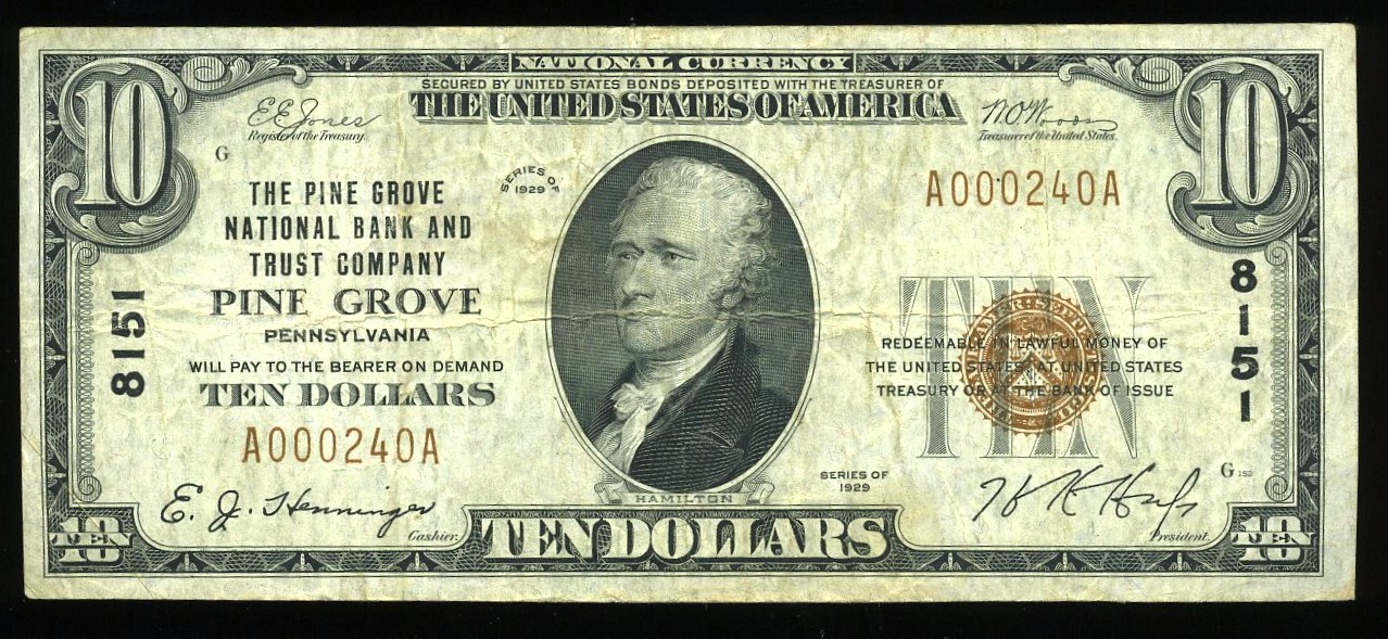 1929 $10 • The Pine Grove National Bank & Trust Co., Pine Grove, Pennsylvania