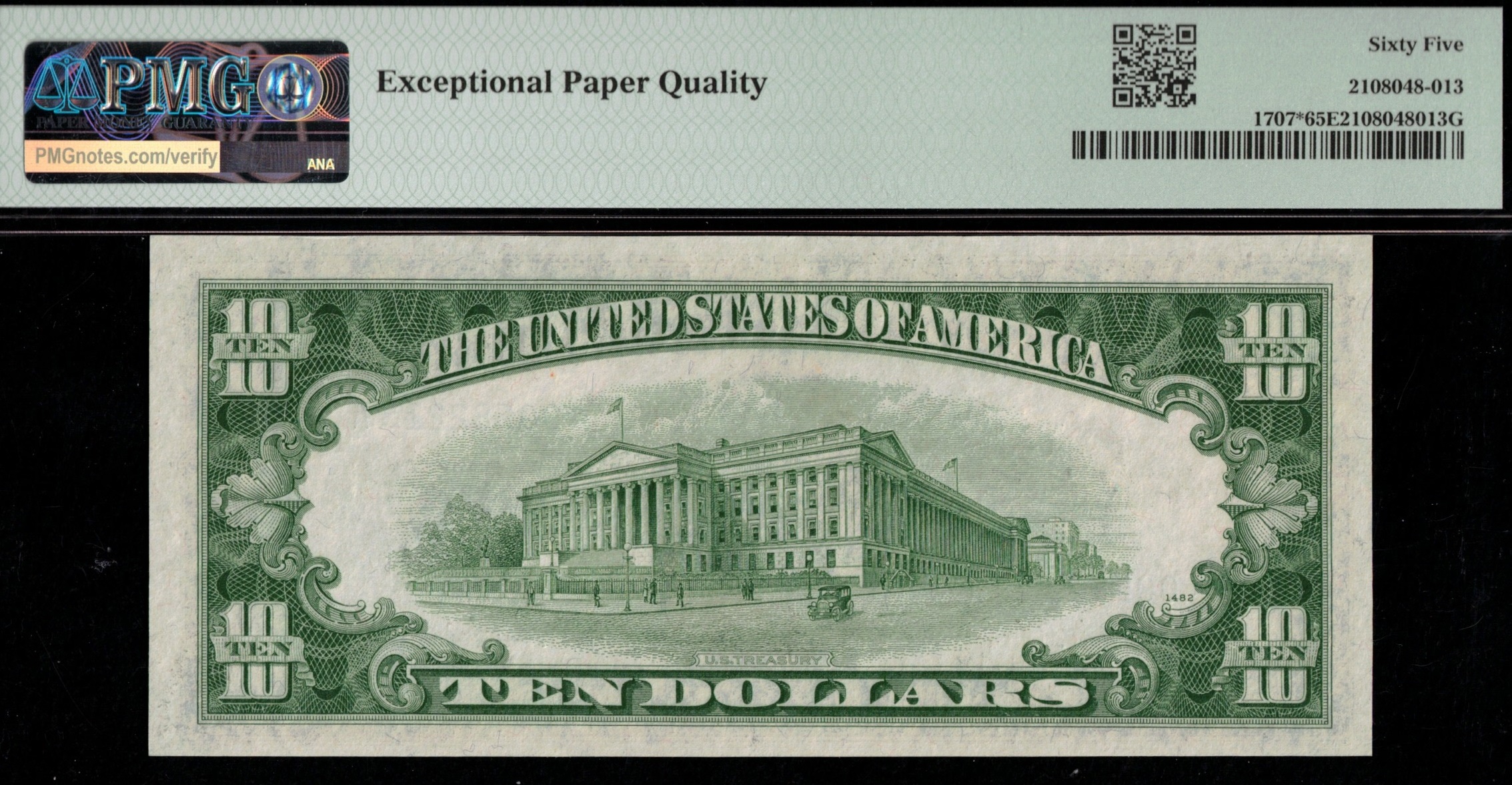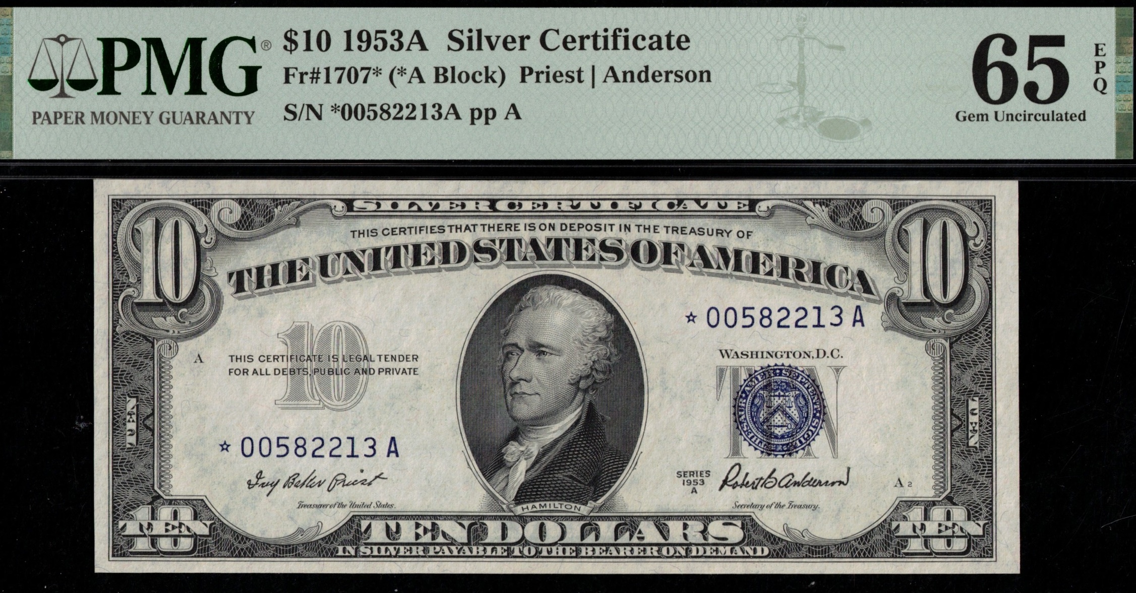FR-1707* 1953A Ten Dollar Silver Certificate serial *00582213A, STAR. Third-party graded P.M.G #65EPQ Gem uncirculated with exceptional paper quality. Bright paper, well centered, great looking note all around. Great fit to that small size type collection needing this type of replacement note. Just #170 total graded by PMG, this one is just #1 of #31 in a 65Q.