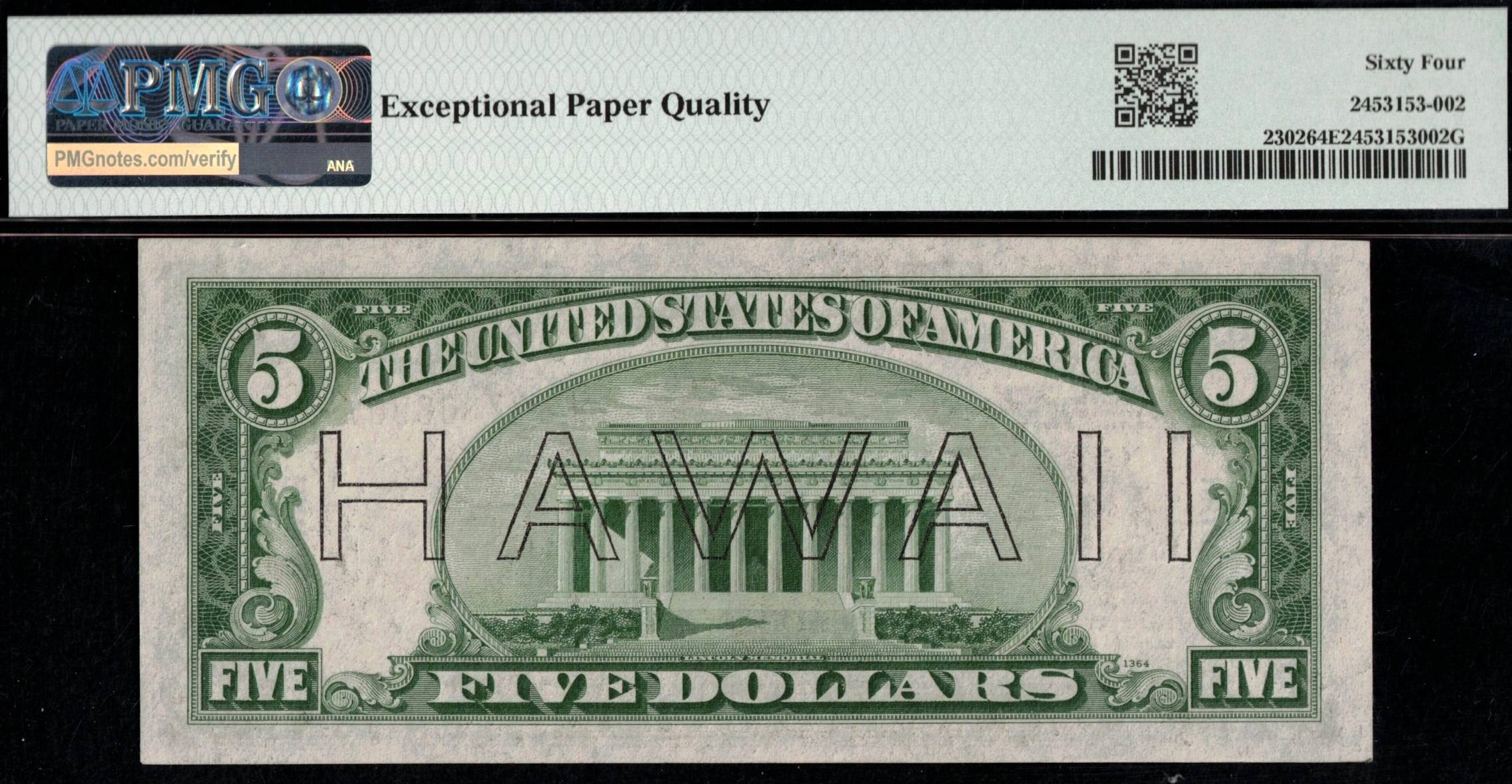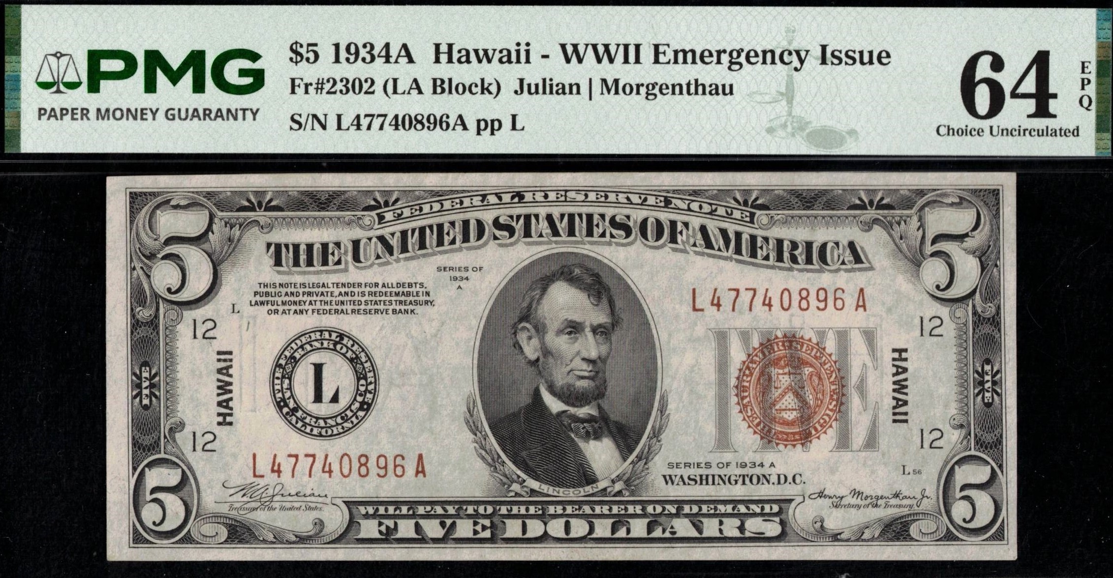 Fr-2302 1934A Series Five Dollar Federal Reserve Note, Emergency Issue, Serial L47740896A. A beautiful piece with original paper quality and a sharp “Hawaii” overprint on the back. The right-side margin prevents it from achieving Gem Status. Third-party graded PMG #64EPQ Choice Uncirculated with exceptional paper quality. Perfect Type Note.
