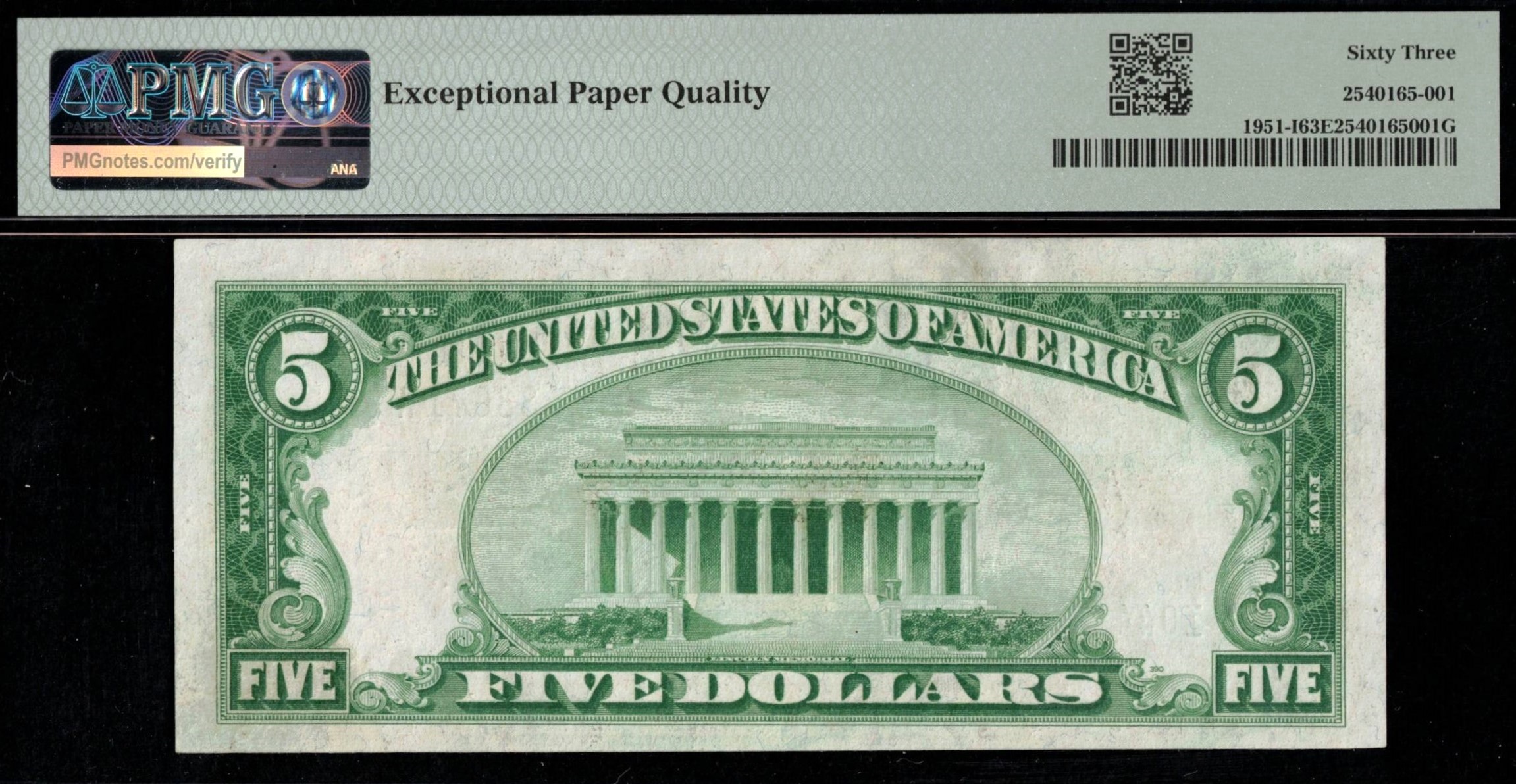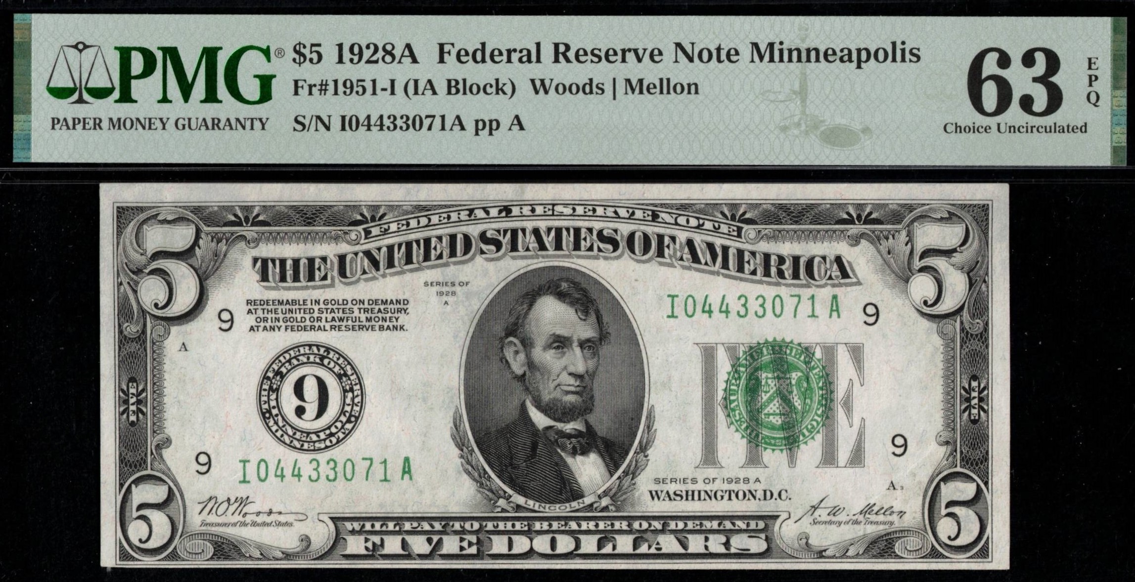 Fr-1951-I 1928A Series Five Dollar Federal Reserve Note from the Minneapolis District, fresh from the pack and slightly off-center from the cut. Third-party graded P.M.G #63EPQ Choice Uncirculated with exceptional paper quality. Only five notes are graded at this level by P.M.G, with three rated higher. This is a rare district numeral to find in uncirculated condition.