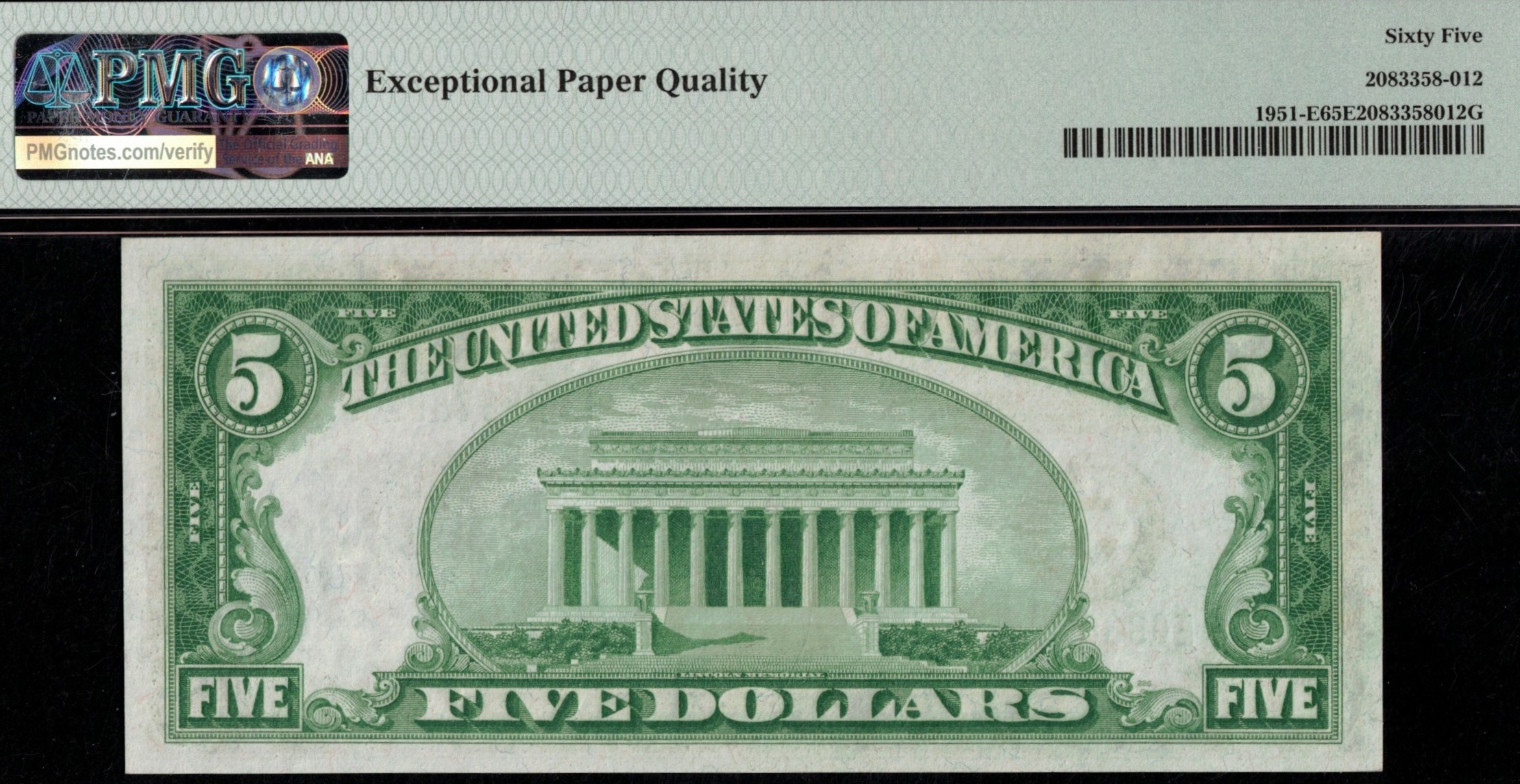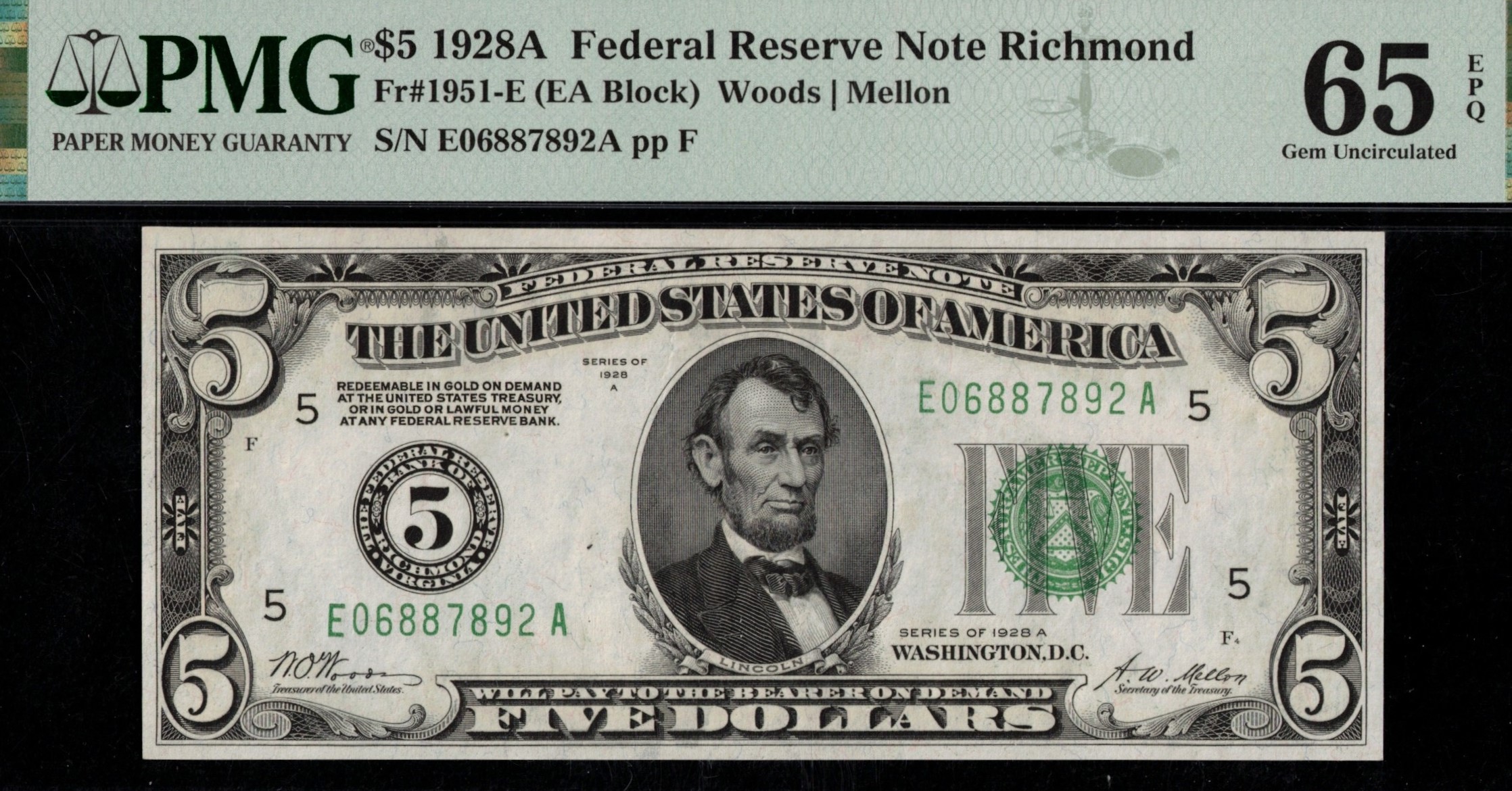 Fr-1951-E 1928A Series Five Dollar Federal Reserve Note from the Richmond District. A bright, well centered note that has great detail throughout. Large numeral #5 on this 1928A series… the appearance just shines inside this graded holder. Third party graded P.M.G #65EPQ Gem Uncirculated with exceptional paper quality. Just three higher than this grade at P.M.G population reports.