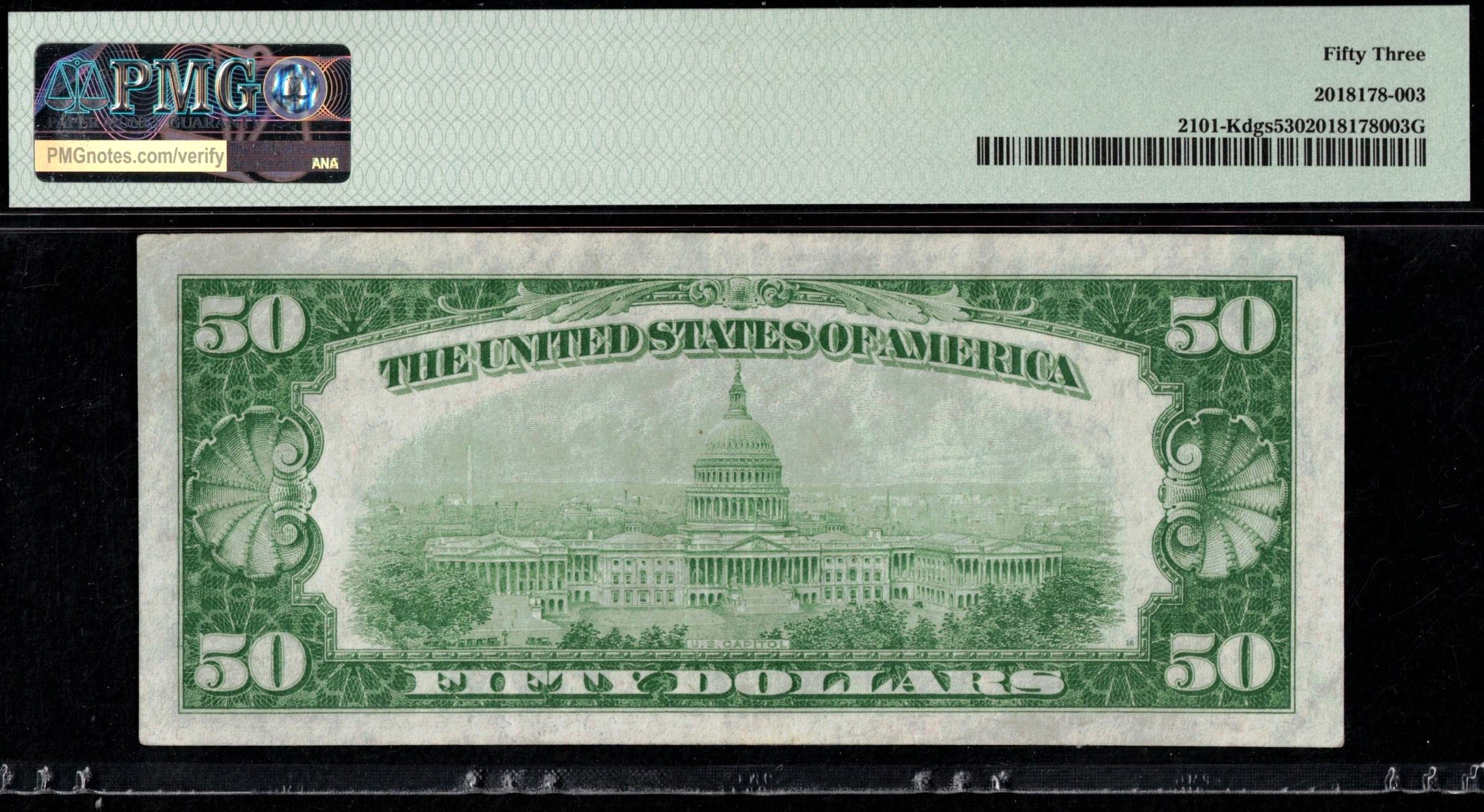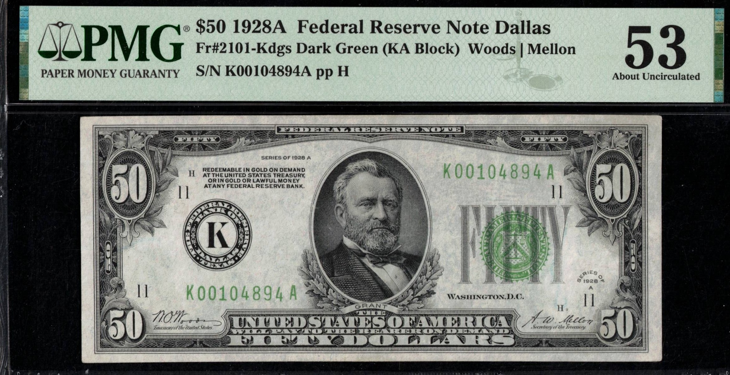 Fr-2101-K 1928A Series Fifty Dollar Federal Reserve Note from the Dallas District. This bright, well-centered note boasts sharp detail throughout, though light circulation keeps it from uncirculated status. Third-party graded P.M.G #53 About Uncirculated, it represents an exceptionally rare district for this series, with only 12 total graded by P.M.G. A truly rare find.
