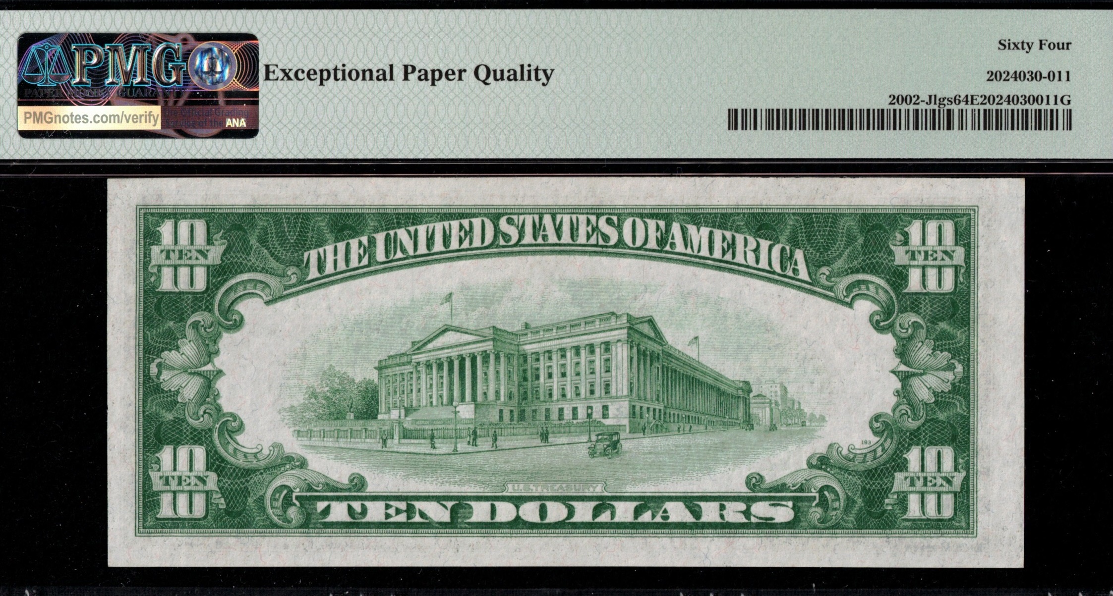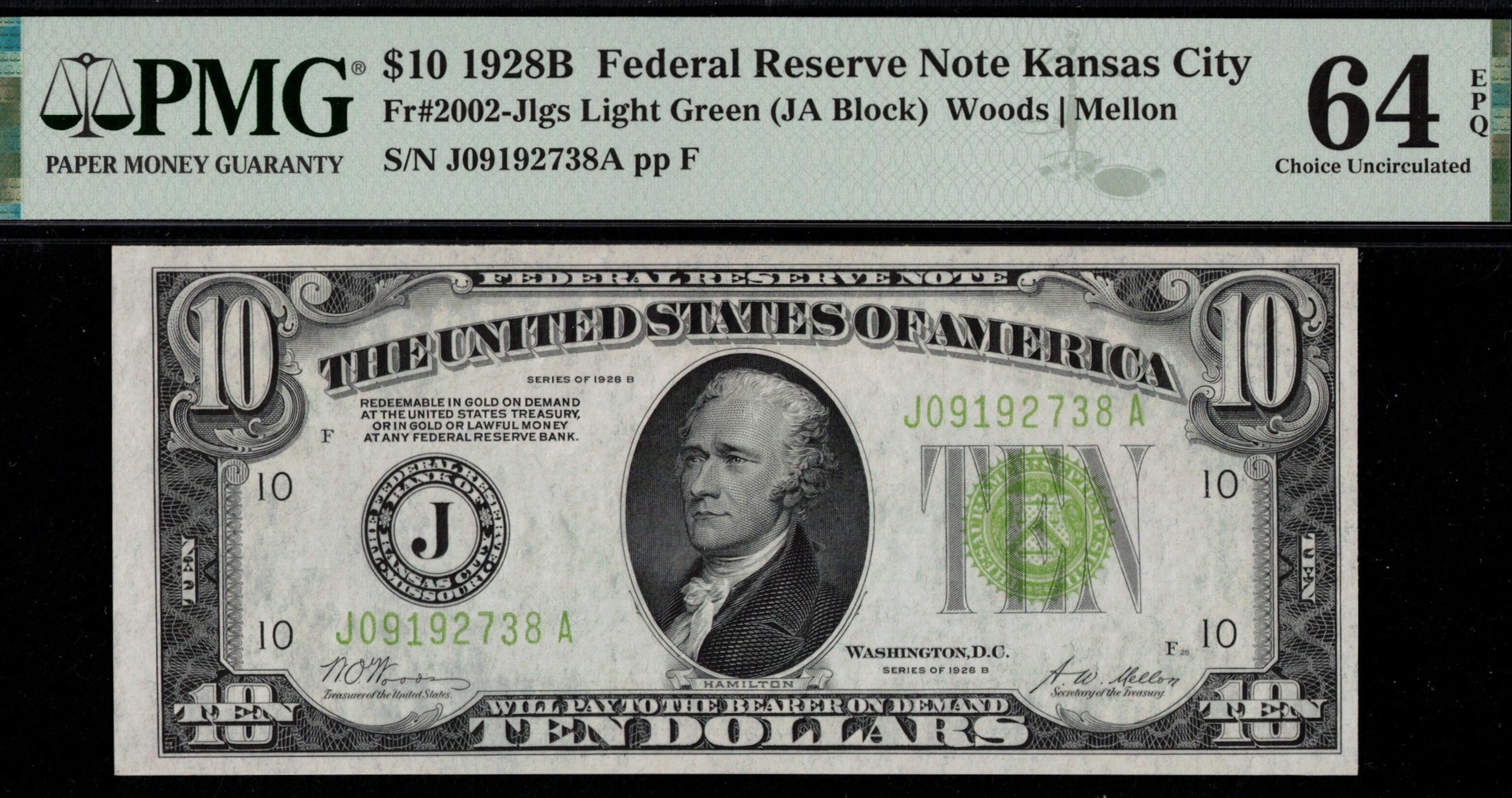 Fr-2002-J L.G.S 1928B Series Ten Dollar Federal Reserve note from the Kansas City District. Third-party graded P.M.G #64EPQ Choice Uncirculated with exceptional paper quality. Centered very well, bright paper…. popular lime green seal variety. Only #48 total graded by P.M.G. Wonder example for this District.