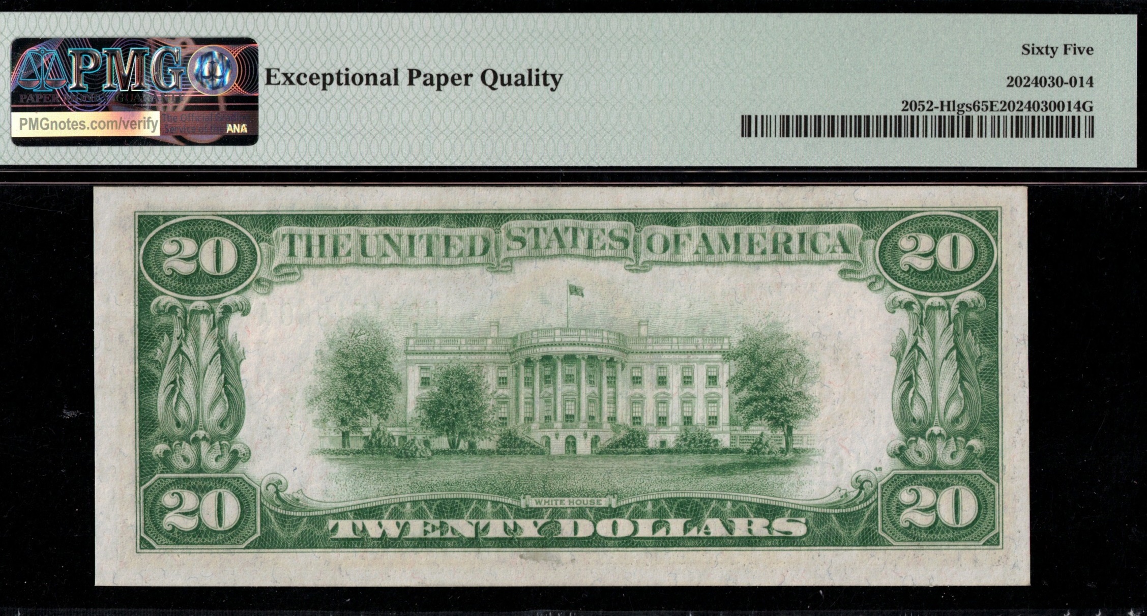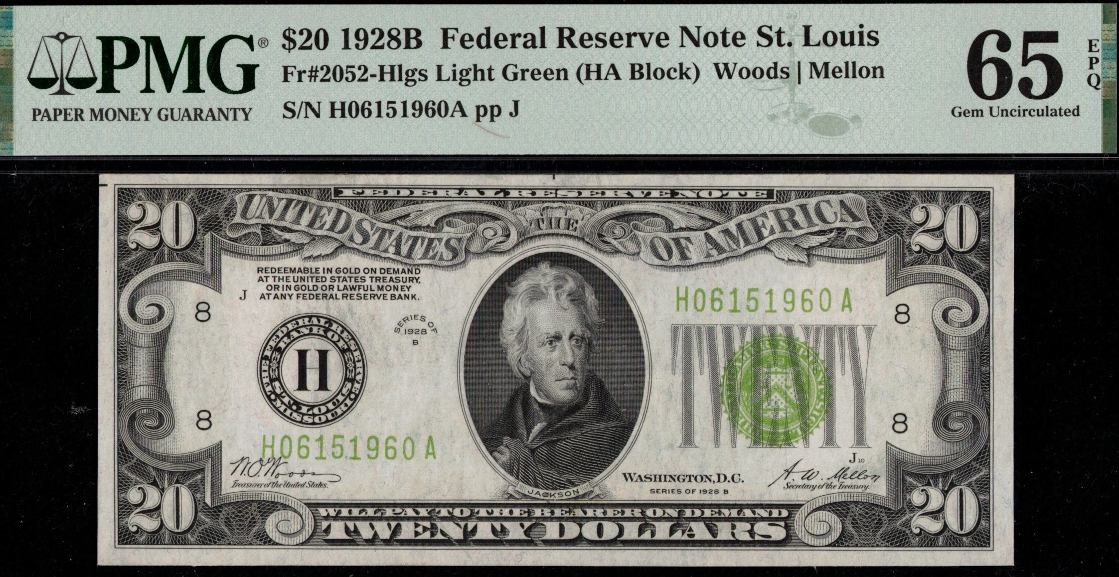 Fr-2052-H L.G.S 1928B Series Twenty Dollar Federal Reserve note from the St Louis District. Third-party graded P.M.G #65EPQ Gem Uncirculated with exceptional paper quality. Centered very well, lime green seal that sticks out on the overprint. Wonderful example for this District. A mere four notes higher in grade, which are #66Q.