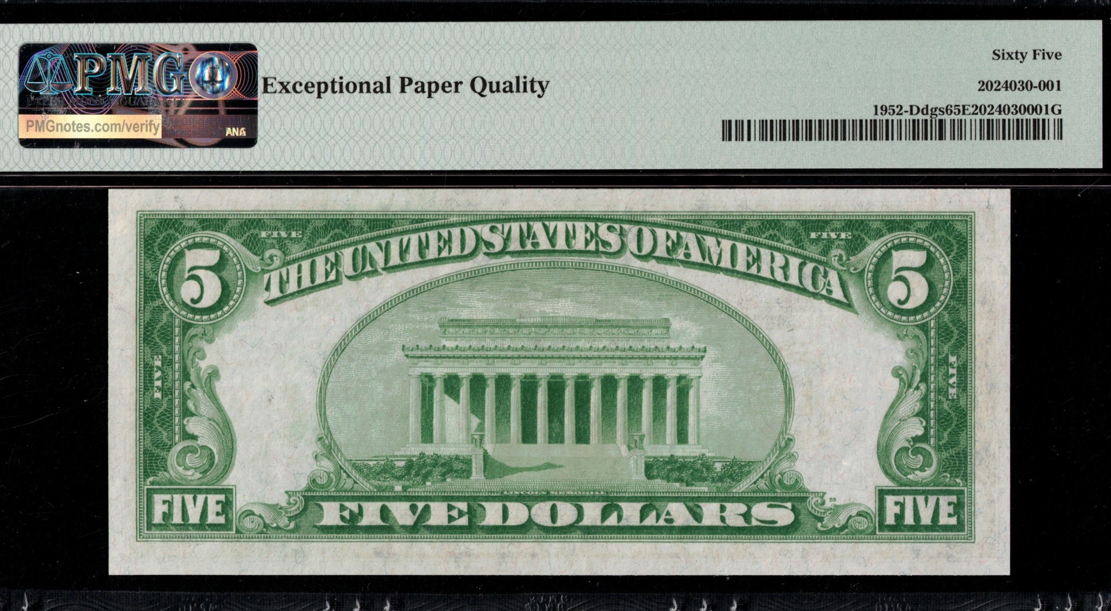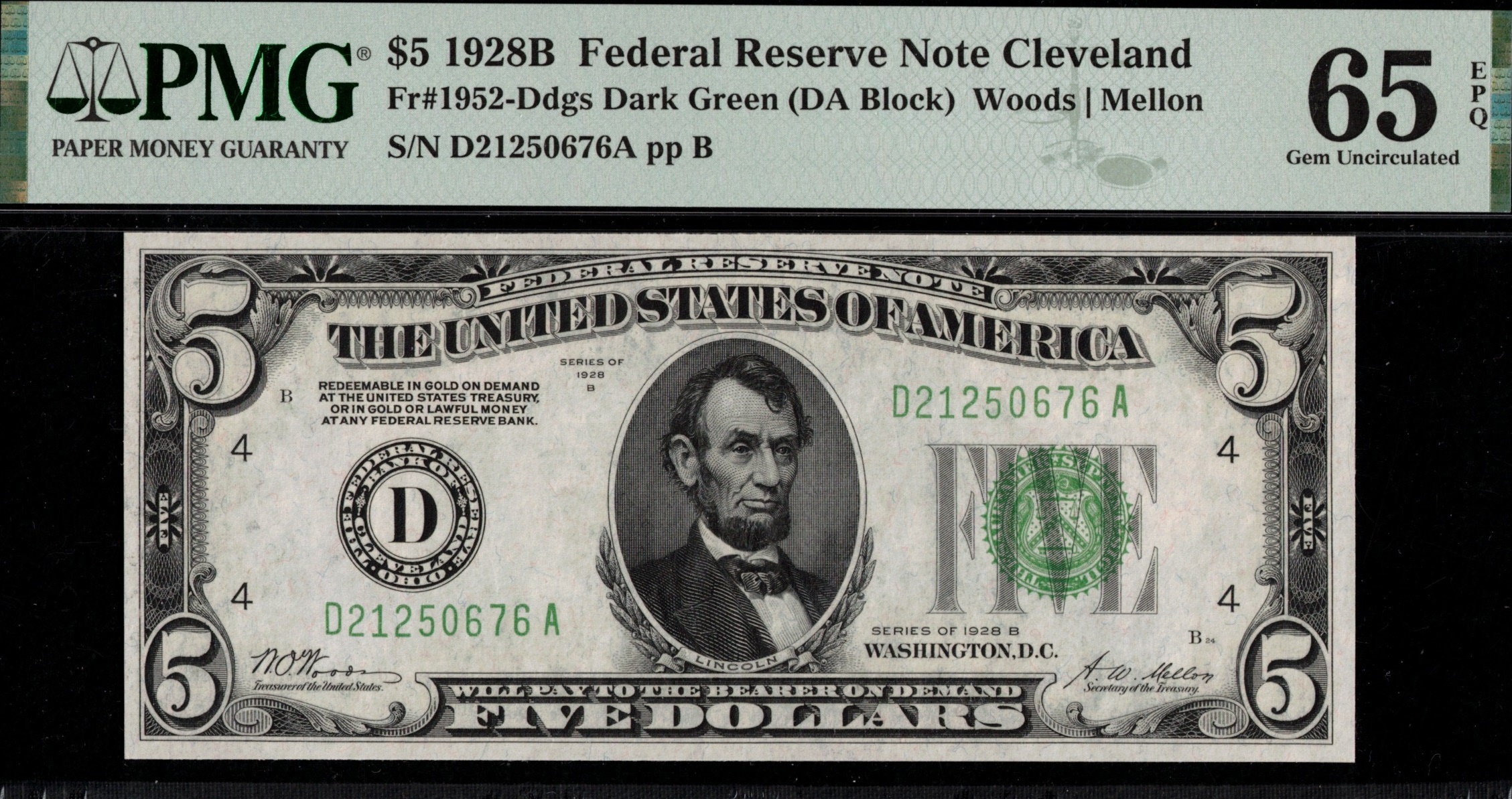 Fr-1952-D D.G.S 1928B Series Five Dollar Federal Reserve note from the Cleveland District. Third-party graded P.M.G #65EPQ Gem Uncirculated with exceptional paper quality. Centered, decent, bright paper, sharp inks. Great looking example for this 28B Series. Just eight higher in grade, according to the PMG population report.