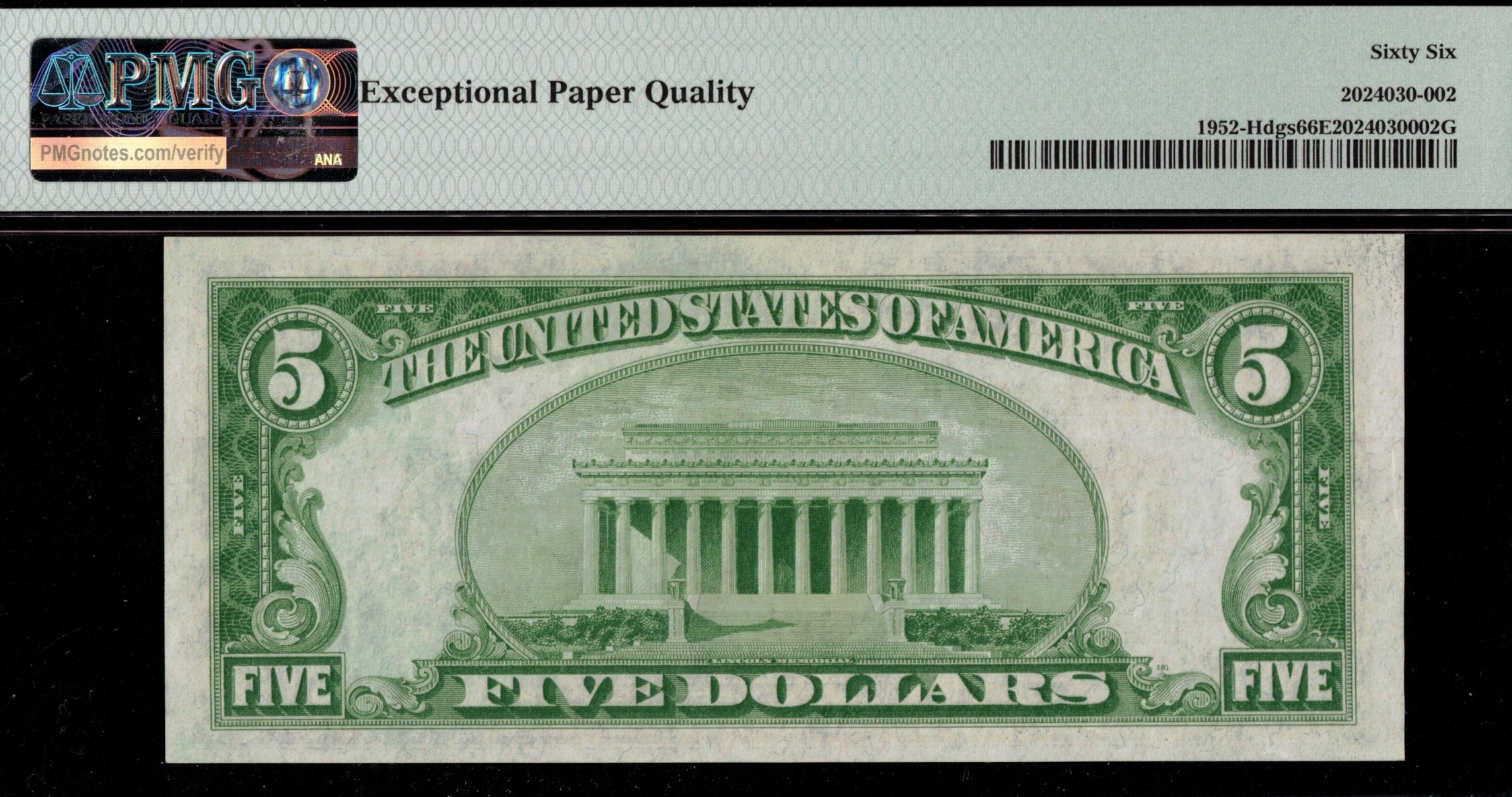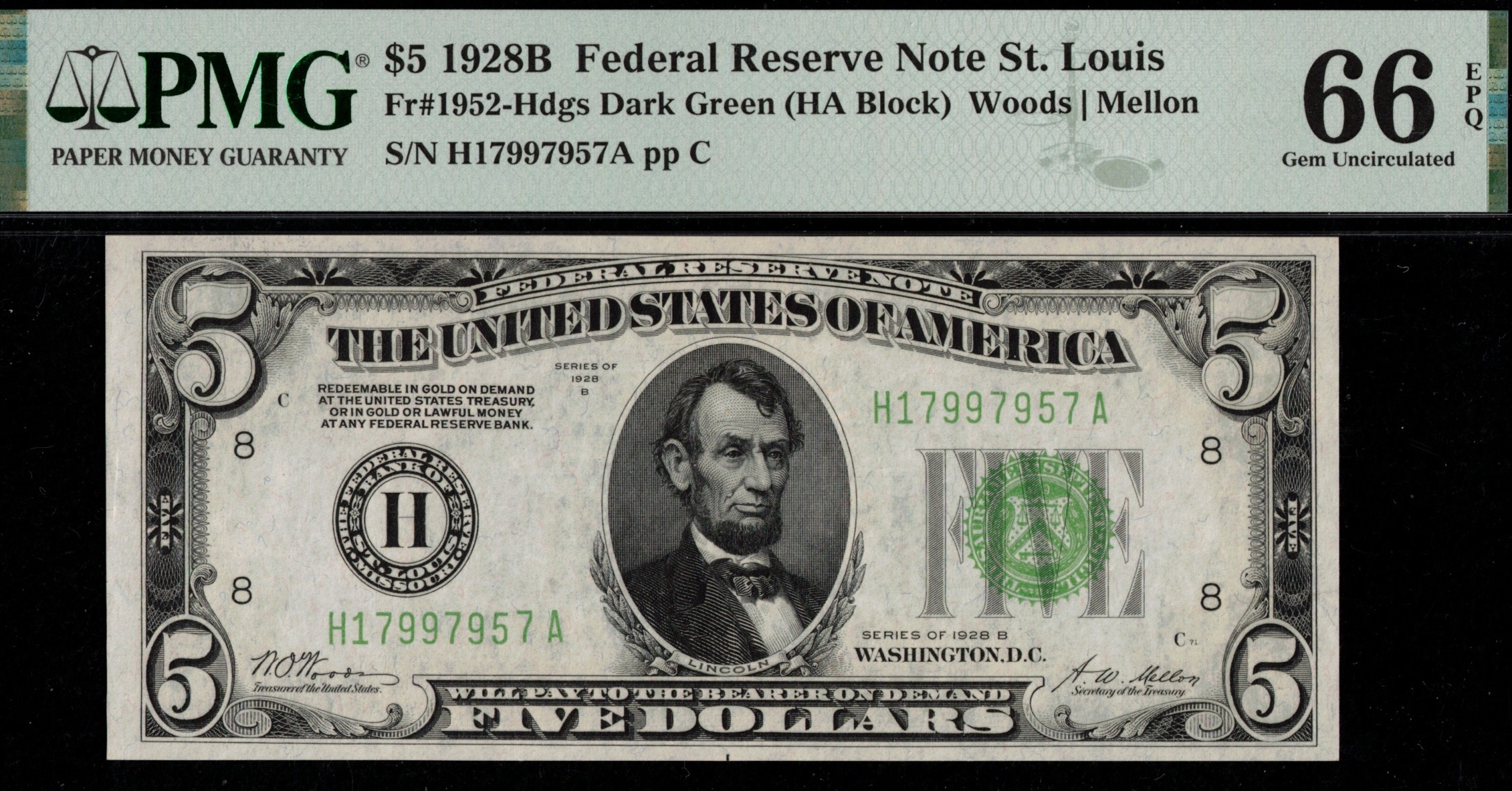 Fr-1952-H D.G.S 1928B Series Five Dollar Federal Reserve note from the St Louis District. Third-party graded P.M.G #66EPQ Gem Uncirculated with exceptional paper quality. Centered, nice, bright paper, sharp inks. A great-looking example of the 28B Series Five. Just eight higher in grade, according to the PMG population report.