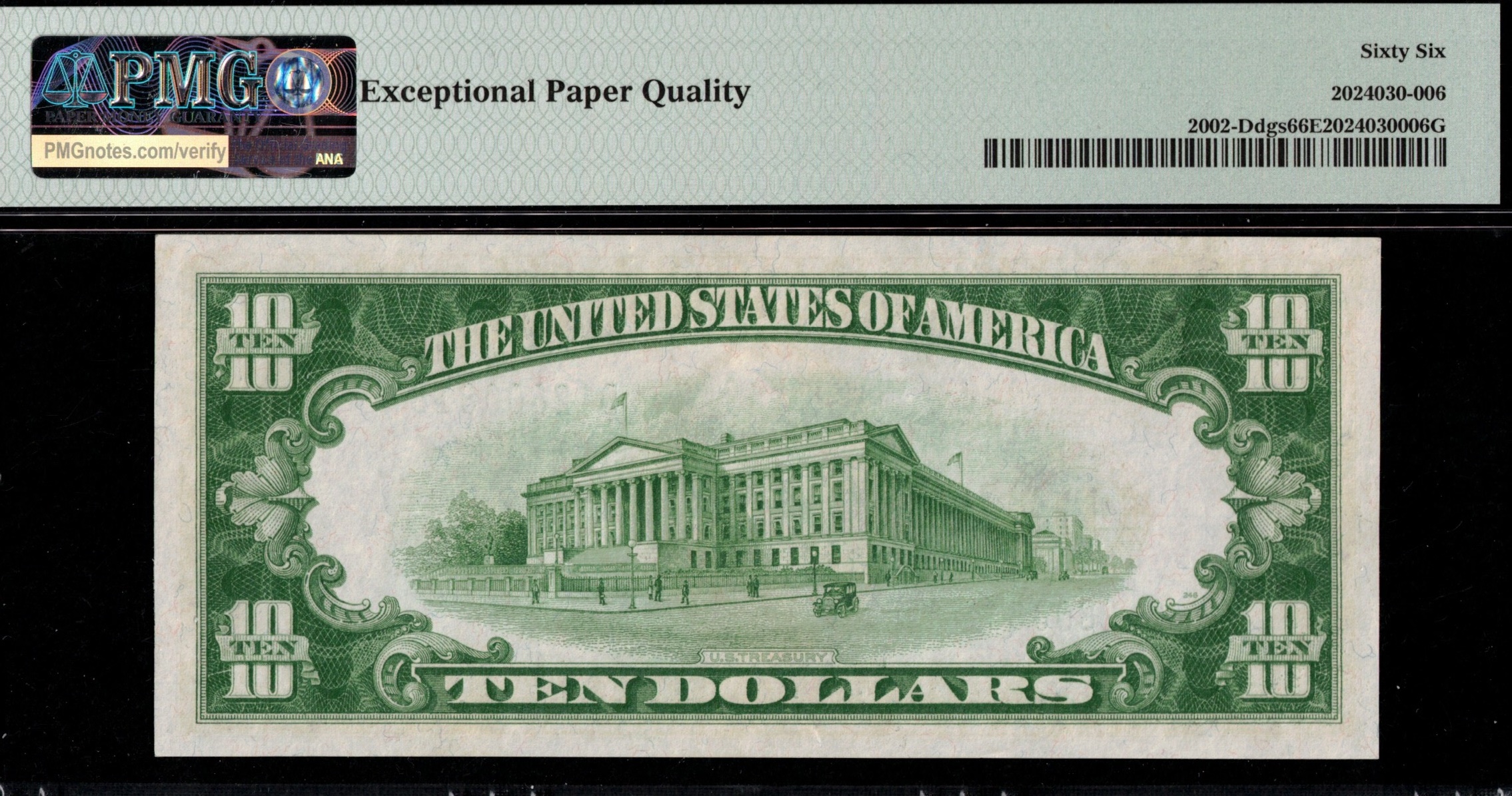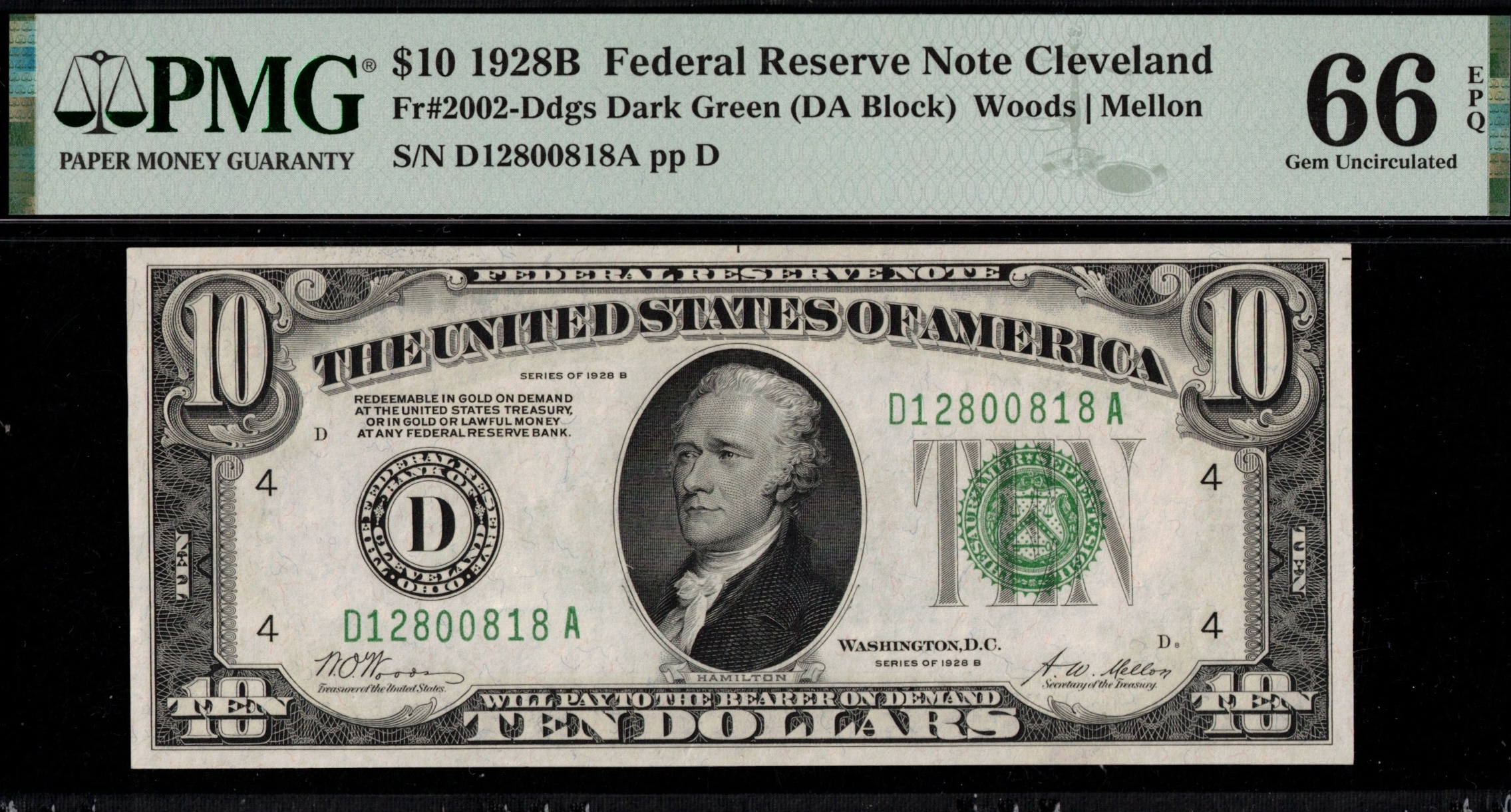 Fr-2050-D D.G.S 1928 Series Ten Dollar Federal Reserve Note from the Cleveland District. A bright, well centered note that has great detail throughout. An addition to that needed type note to join the other $10’s in the type set. Third party graded P.M.G #66EPQ Gem Uncirculated with exceptional paper quality.