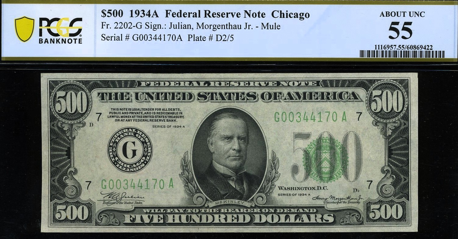 Lightly circulated 1934A $500 Federal Reserve Note (FR‑2202) from the Chicago District, featuring strong inks, and excellent centering. Approaches About Uncirculated quality with impressive eye appeal, offering a premium high‑denomination note at a more accessible price point.