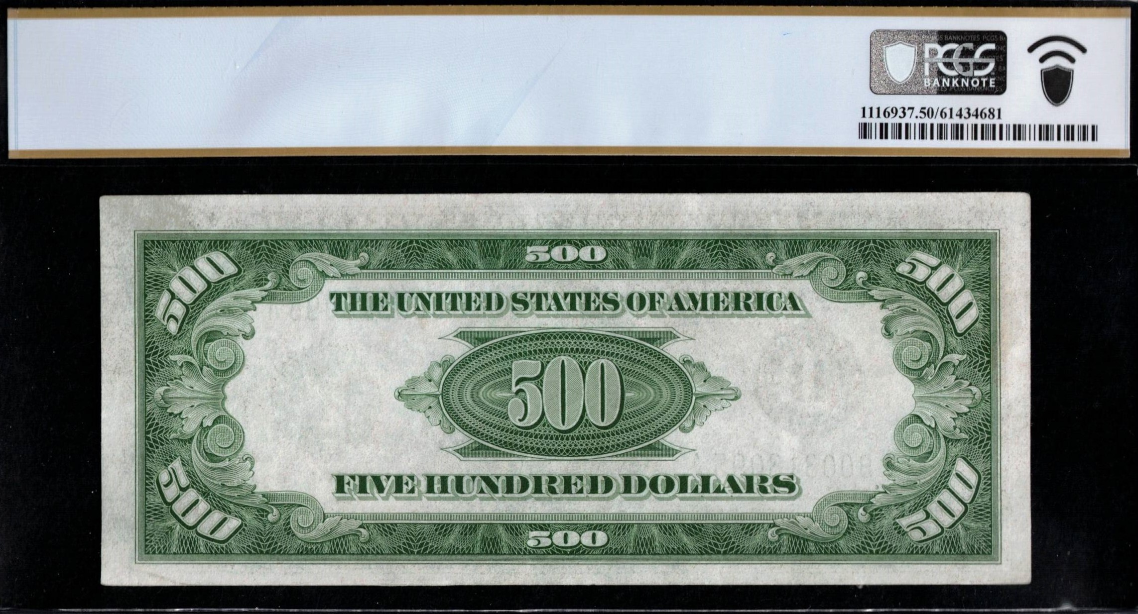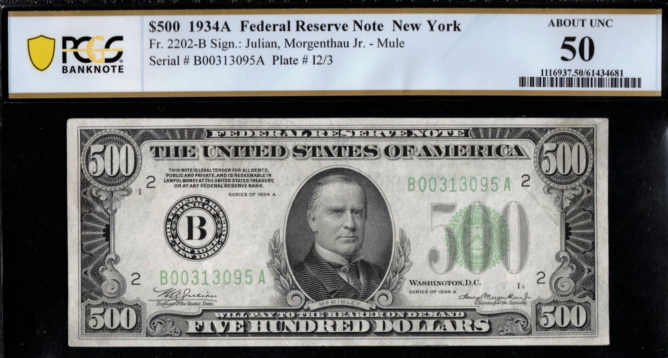 FR-2202-B 1934A Series Five Hundred Dollar Federal Reserve note coming from the New York District. Well centered, last series printed note that was third-party graded P.C.G.S #50 About Uncirculated. Comment-free, good-looking note, just shy of being fully uncirculated.