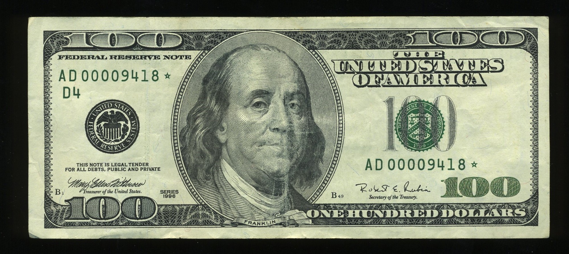 1996 Series $100 Federal Reserve Note from the Cleveland District, serial number AD00009418* STAR. Pulled from circulation, this problem-free, very fine plus note is a standout. Originally printed and sent overseas, only a small number found their way back to the States. This Cleveland star is the key to the 1996 Series first-generation $100s, with just 160,000 printed.