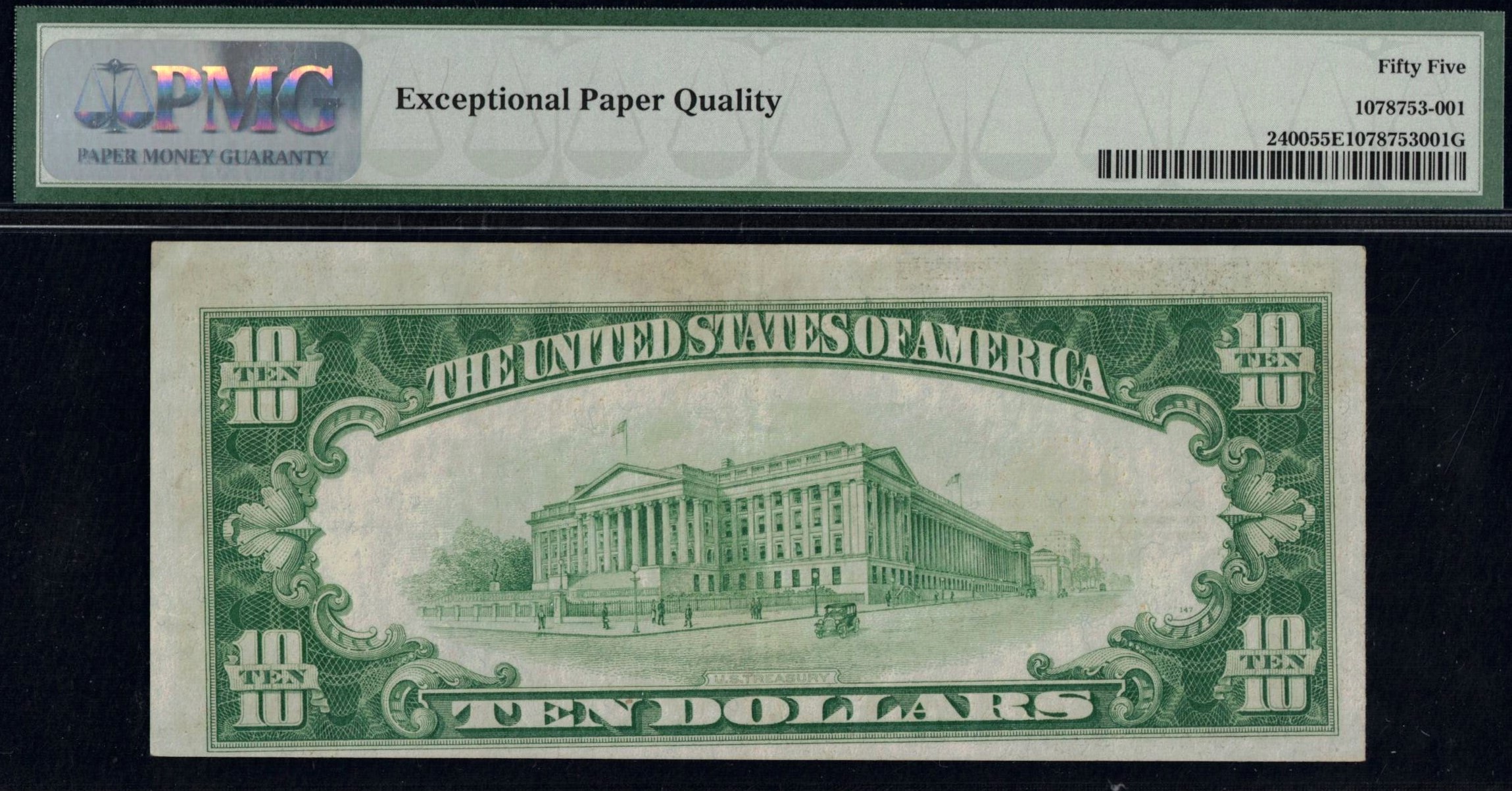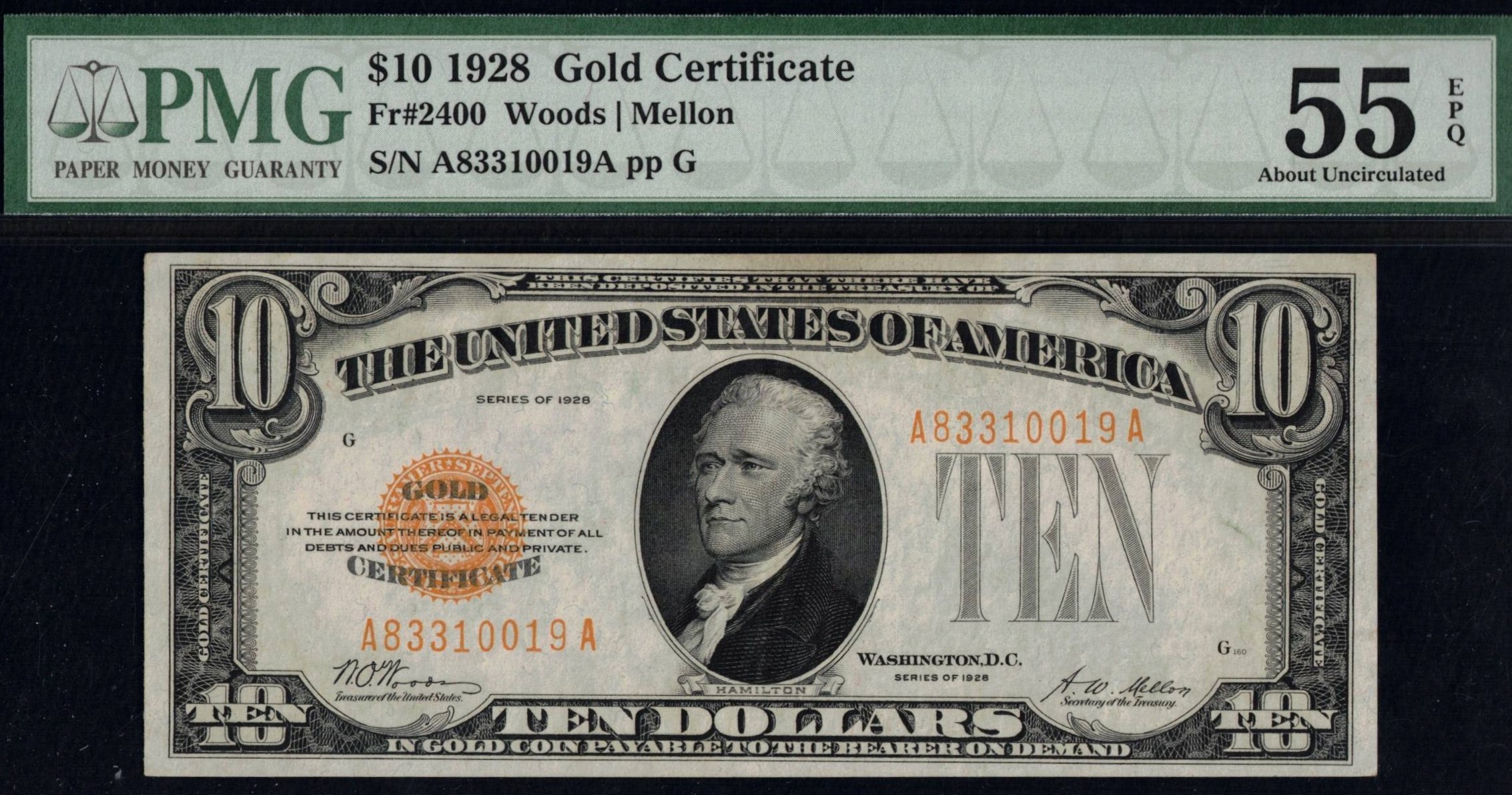 FR-2400 1928 Series Ten Dollar Gold Certificate, third-party graded P.M.G #55EPQ Choice About Uncirculated with exceptional paper quality. A bright-looking note, well-centered on the front but slightly off on the back. An original, high-quality note with great eye appeal and sharp overprint. Gem Uncirculated examples of these sought-after gold certificates are now selling for over $2,000.