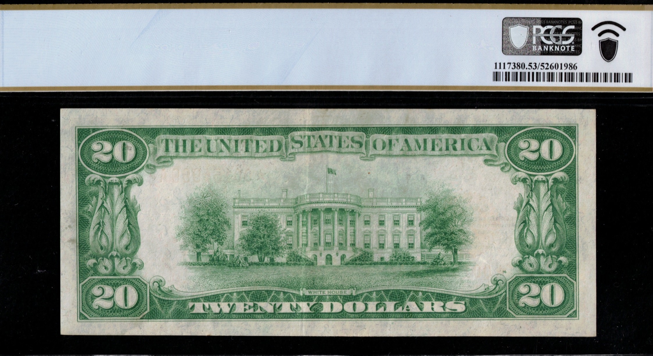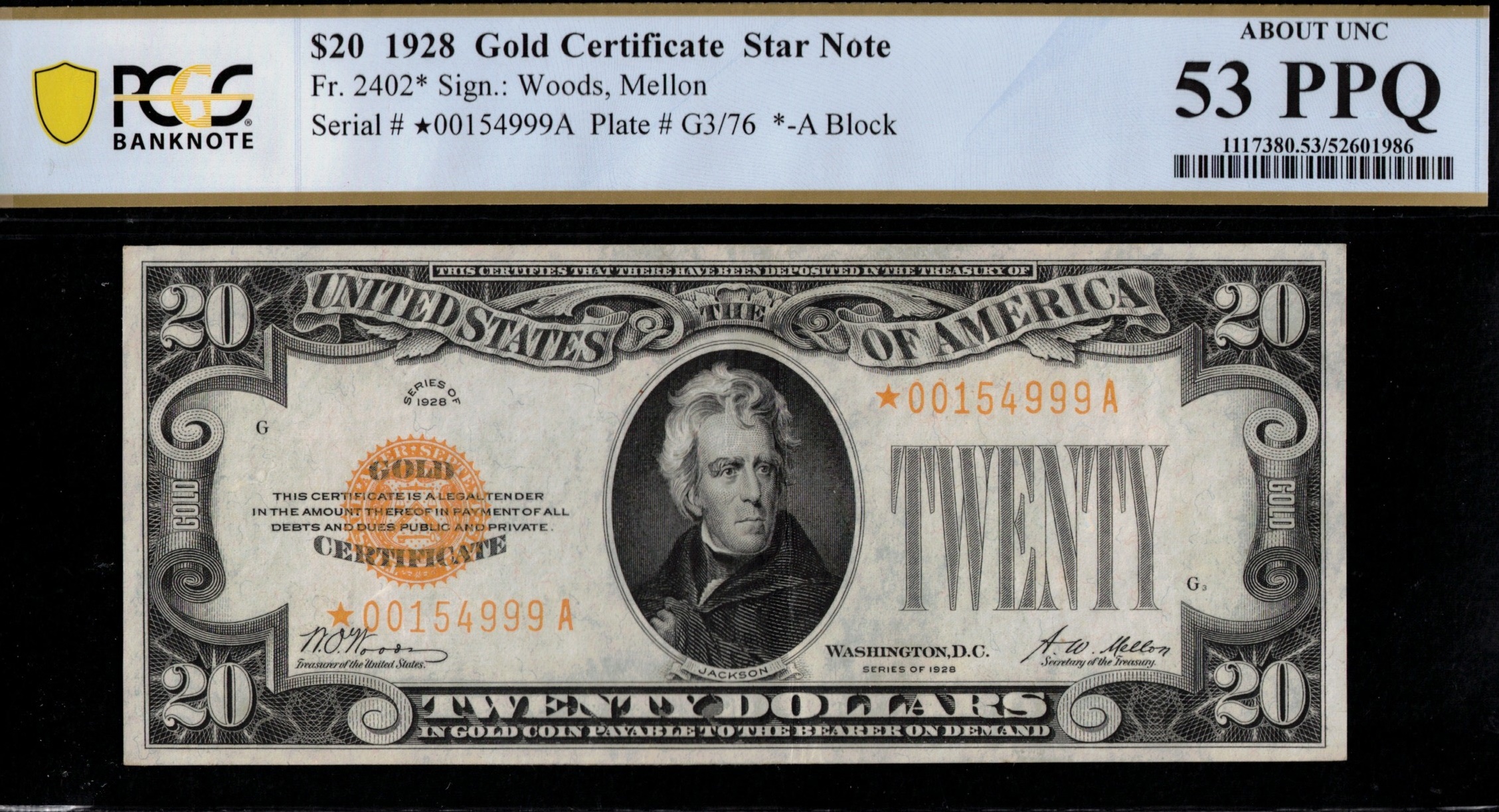 FR-2402* 1928 Series Twenty Dollar Gold Certificate Star Note. A slightly mis-handled example that made its way into a Choice About Uncirculated P.C.G.S #53PPQ holder. This was previously graded in 2009 by the original P.C.G.S. company. It came to auction then in 2009, in a CLCT original P.C.G.S holder at the 53PPQ grade, where it realized $4025.00 at a Heritage Auction at the Fun show, January 9th, 2009. An original premium paper quality replacement note that truly is NOT offered as much, correct…….. having the added qualifier versus NOT on this type of note is a major bonus. Great looking note, centered well, has a light fold down the middle of the note, touch of handling.