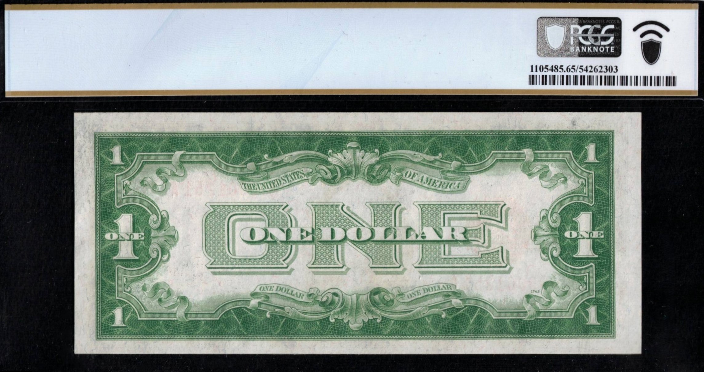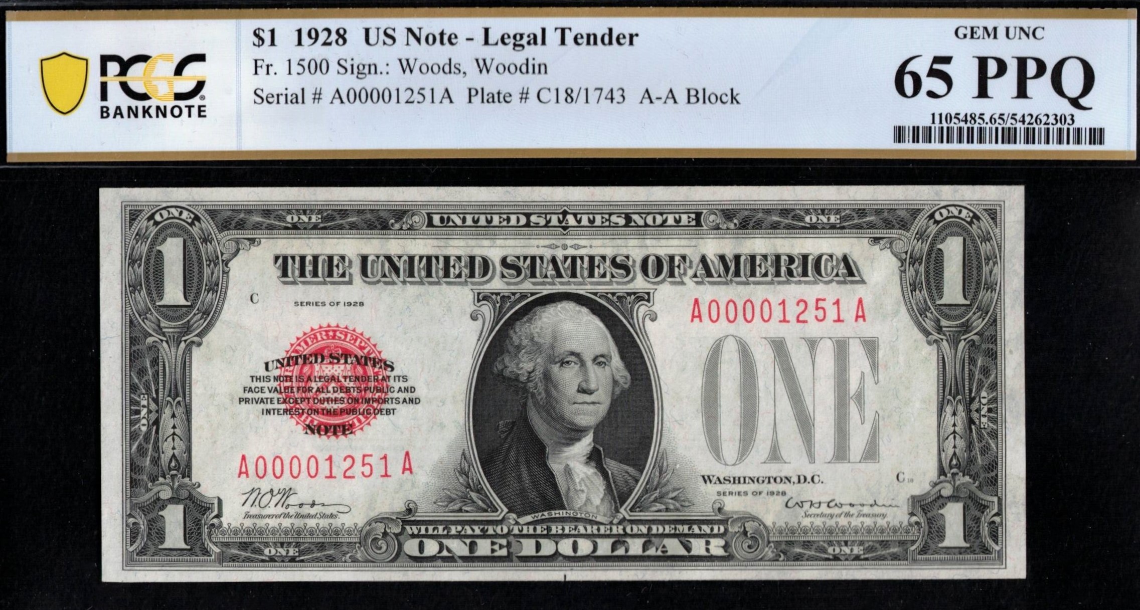 FR-1500 1928 Series One Dollar Legal Tender is from the first batch of 5,000 issued and features a low serial number, #1251 (A00001251A). It’s been graded by P.C.G.S as #65PPQ Gem Uncirculated, highlighting its premium paper quality. This exceptional note combines its high grade with the rarity of the low serial number. Bright paper with a dark red overprint, Plate C.